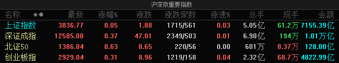 | | | | | 沪深京重要指数 | | | | | --- | --- | --- | --- | --- | --- | --- | --- | | 名称 *● | 最新 | 涨幅% | | 涨跌 涨跌家数 张速% | | 总手 | 现手 金额 | | 上证指数 | 3880.22 | 1.13 | 43.45 | 2057/212 | -0.01 | 3.01亿 | 1.37万 4663.91亿 | | 深证成指 | 12841.60 | 2.04 | 256.52 | 2632/238 | 0.02 | 4.45 7. | 371 7077.33亿 | | 北证50 | 1408.85 | 1.65 | 22.81 | 258/23 | 0.02 | 392万 | 436 90.66 Z | | 创业板指 | 3005.23 | 2.60 | 76.19 | 1293/89 | 0.04 | 1.52 7. | 371 3478.68 7. | 盘面上热点轮番活跃,全市场近4900只个股上涨。从板块来看,算力硬件概念延续强势,特发信息3连 板,长飞光纤、汇绿生态涨停。AI应用概念再度爆发,实达集团4 ...