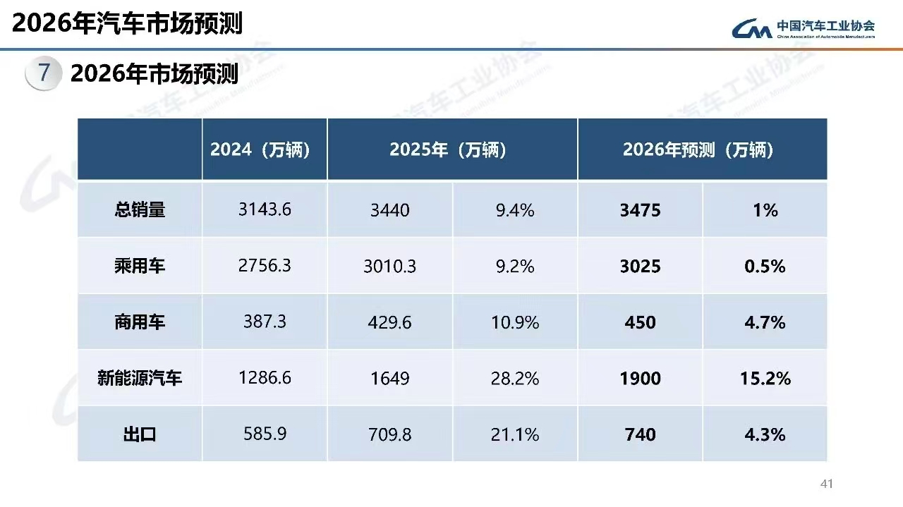 其中,新能源汽车销量预计达1900万辆。 | | 2024 (万辆) | 2025年 (万辆) | | 2026年预测(万辆) | | | --- | --- | --- | --- | --- | --- | | 总销量 | 3143.6 | 3440 | 9.4% | 3475 | 1% | | 乘用车 | 2756.3 | 3010.3 | 9.2% | 3025 | 0.5 | | 商用车 | 387.3 | 429.6 | 10.9% | 450 | 4.7 | | 新能源汽车 | 1286.6 | 1649 | 28.2% | 1900 | 15.2 | | 래그 | 585.9 | 709.8 | 21.1% | 740 | 4.3 | 中国汽车工业协会副秘书长陈士华表示,2025年汽车行业顶住贸易保护和全球产业链重构等外部压力,克服技术攻关难题、行业内卷多重挑战,展现出强大 韧性和活力,实现了产业规模和发展质量双提升。 在政策利好、供给丰富和基础设施持续改善等多重因素共同作用下,新能源汽车持续增长。2025年,新能源汽车产销量超1600万辆,其中国内新车销量占比 超50%,成为我国汽车市场主导 ...