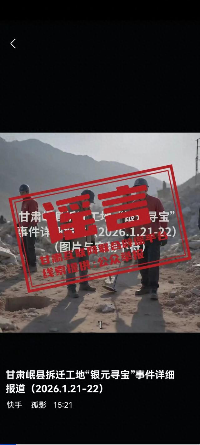 近日,有网民发布"岷县一拆迁工地挖出银元"等图文视频,并有部分自媒体用户为博取流量,恶意拼接 展示挖出银元的视频图片,造成不明真相的群众盲目跟风并聚集挖掘。经我镇组织核查,证实为谣言虚 假信息,并向公安机关报案,公安机关已对相关人员进行了约谈。 ks a ch 发现 银行? 官方到账具 VE Winter J: LET FEA 地镇政府、文保所回应 -T- 甘肃岷县拆迁工地"银元寻宝"事件详细 报道 (2026.1.21-22) 快手 孤影 15:21 纵览热点 | 甘肃岷县一拆迁工地发现银斗营 元?多人在现场徒手挖掘, 有头用ebnews24h Q 纵览新闻 抖音 纵览新闻 11:16 " 三 元 可 手元 上与有 服县拆迁工地应 LAFF (1) ◎ 0 3 | 00:56 / 01:07 倍速 超清 2351次播放 = 食 收藏 命分享 nly 17 05:09 ● N * 304 ***!! ... | 39 * ( Q 真实的元宝是什么模样 搜索 × 岷县岷阳镇人民政府 2026年1月22日 来源:甘肃省网络违法和不良信息举报 网络空间不是法外之地,编造和传播网络谣言需承担相应法律责任。请广大网民自 ...
