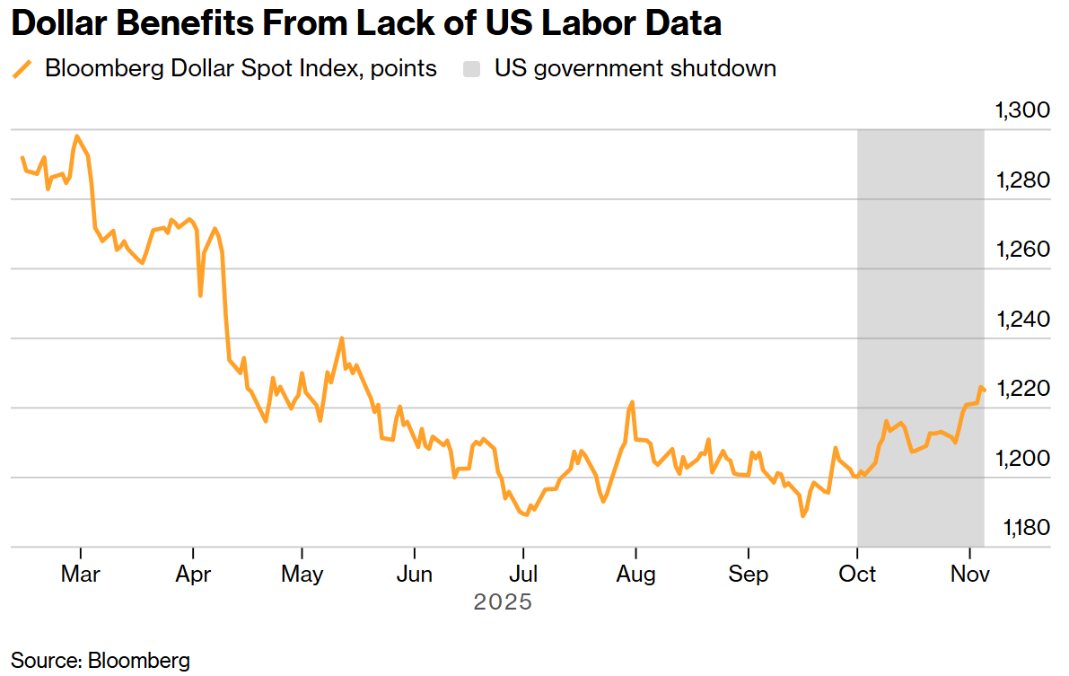 Core Viewpoint - The U.S. government shutdown is masking structural weaknesses in the labor market, which could lead to a decline in the dollar once economic data resumes publication [1] Group 1: Labor Market Insights - The absence of U.S. labor market data allows investors to overlook the potential trend of a structural slowdown in hiring [1] - The latest non-farm payroll report indicated a significant slowdown in job growth, with the unemployment rate reaching its highest level since 2021 [5] - Challenger, Gray & Christmas Inc. reported that the number of layoffs announced by U.S. companies in October was the highest for that month in over 20 years [6] Group 2: Dollar Performance and Predictions - The Bloomberg Dollar Spot Index fell for the second consecutive day, marking its largest decline since mid-October, as traders increased bets on a Federal Reserve rate cut [1] - The dollar has declined by 6.8% year-to-date, with the first half of the year showing the worst performance in decades [5] - Analysts predict that the dollar may face significant selling pressure, particularly against the euro, with expectations that the euro could rise to 1.20 against the dollar by year-end [6] Group 3: Federal Reserve and Interest Rates - The ongoing government shutdown raises doubts about the Federal Reserve's ability to receive sufficient data to support another rate cut in December [5] - Morgan Stanley shifted its outlook on the dollar from bearish to neutral, indicating that a significant change in U.S. interest rate prospects is needed for the dollar to sustain its strength [6] - The narrative surrounding the labor market is becoming increasingly soft, which could shift the support from yield-driven factors to potential risks [5]