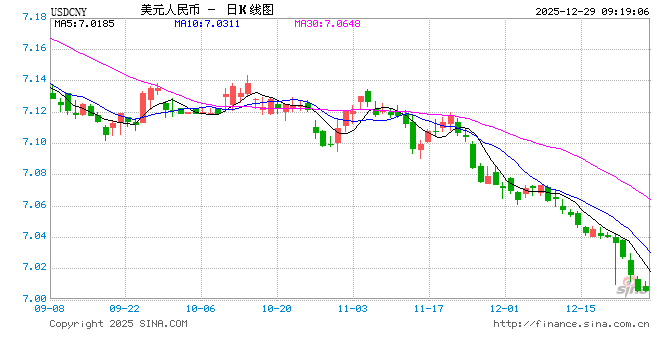 专题:7.0在望!人民币汇率刷新逾一年新高 影响几何? 热点栏目 自选股 数据中心 行情中心 资金流向 模拟交易 客户端 12月25日,离岸人民币兑美元升破7关口,为2024年以来首次。 人民币兑美元中间价报7.0392,上调79点,升值至2024年9月30日以来最高,升幅创2025年8月27日以来 最大。 人民币汇率升值"破7"的可能性大 过去近一个月,人民币对美元汇率强势升值,引起市场广泛关注。究其原因,美元指数走软为人民币汇 率的潜在升值创造了较为友好的外部环境,内部中国经济的韧性与吸引力构成了坚实的基本面支撑,叠 加年底临近或有结汇需求释放,均支撑人民币汇率走升。 对于本轮人民币升值的原因,市场普遍认为,美元整体偏弱,美元指数出现明显下跌,跌幅逼近10%, 叠加国内权益市场表现亮眼吸引外资流入等,人民币兑美元汇率稳中有升,整体维持较强韧性。短期内 人民币兑美元汇率仍将处于偏强运行状态,并有望在2026年保持温和升值。 展望后续汇率走势,明明表示,从政策层面看,稳汇率的目标或在于引导市场预期,防止汇率市场形成 单边一致性预期并自我强化。往后看,预计2026年人民币有望温和升值,但汇率中枢破"7"的行情或 ...