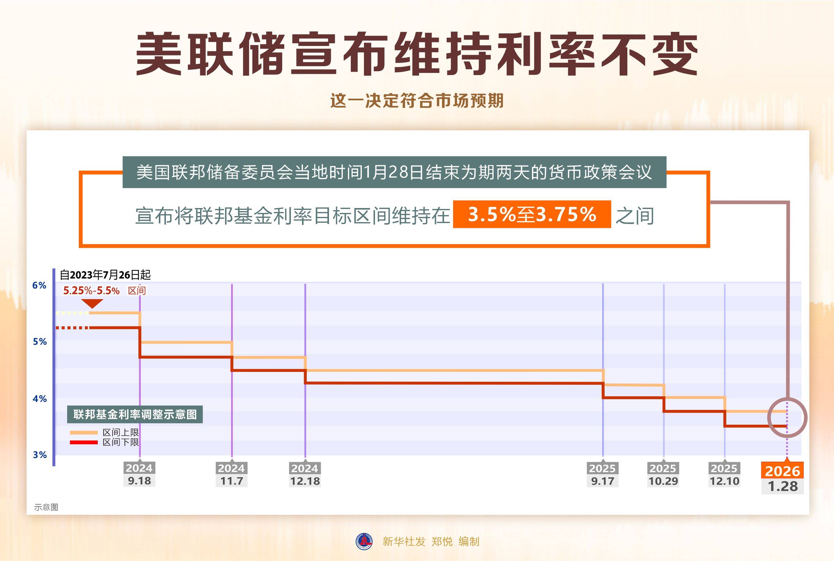 自2023年7月26日起 6% 5.25%-5.5% 区间 5% 4% 联邦基金利率调整示意图 区间上限 区间下限 3% 2024 2024 2024 9.18 11.7 12.18 J 美联储宣 美国联邦储备委员会当地日 宣布将联邦基金利率目 新华社图表,北京,2026年1月29日 美国联邦储备委员会1有28日结束为期两天的货币政策会议,宣布将联邦基金利率目标区间维持在3.5%至3.75%之间不变。这一决定符合市场预期。 新华社发 郑悦 编制 ...