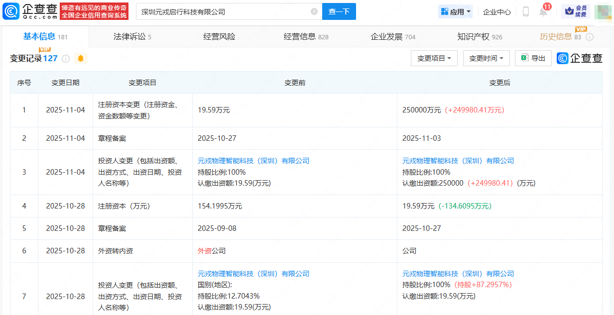 Core Insights - Shenzhen Yuanrong Qihang Technology Co., Ltd. has increased its registered capital from 195,900 RMB to 2.5 billion RMB, indicating significant growth and investment potential in the autonomous driving sector [1][2]. Company Information - The company was established in February 2019 and is wholly owned by Yuanrong Physical Intelligent Technology (Shenzhen) Co., Ltd. [1]. - The legal representative of the company is Zhou Guang, and its business scope includes technology development in autonomous driving, artificial intelligence, and computer application software [1]. Capital Changes - The registered capital change occurred on November 4, 2025, with an increase of 249,980.41 thousand RMB [2]. - Prior to this change, the registered capital was 19.59 thousand RMB, reflecting a substantial increase in financial backing [2]. Shareholder Information - Yuanrong Physical Intelligent Technology (Shenzhen) Co., Ltd. holds 100% of the shares in Yuanrong Qihang, with a subscribed capital of 250,000 thousand RMB as of September 9, 2025 [3].