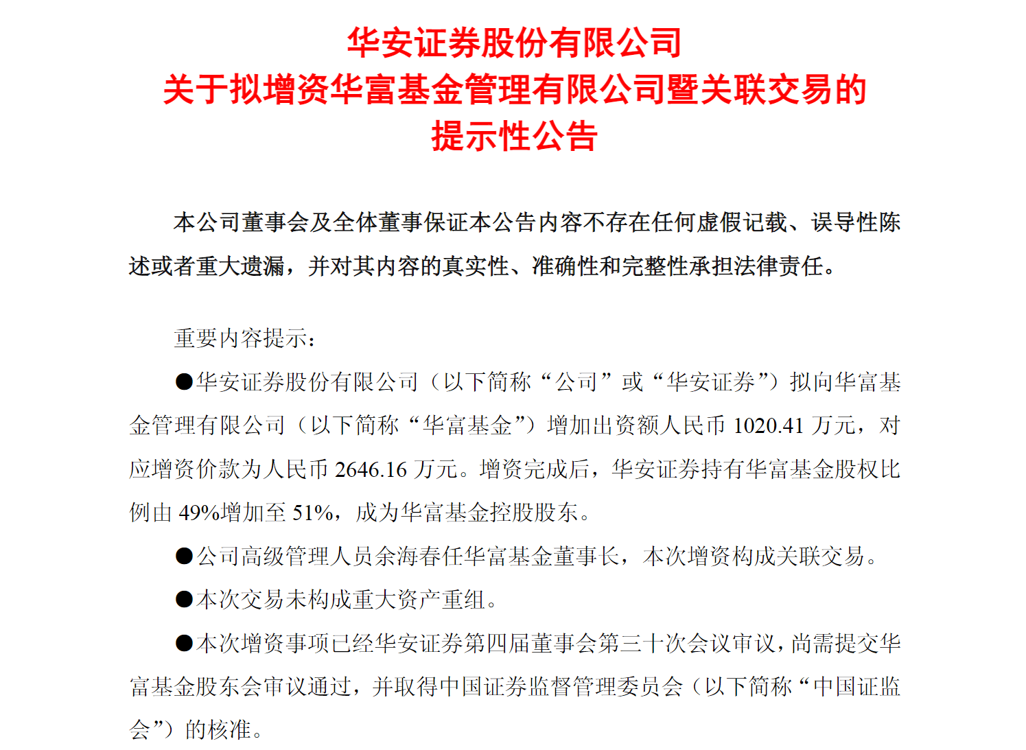 本报讯 (记者徐一鸣)1月12日晚间,华安证券(600909)股份有限公司(以下简称"华安证券")发布 公告称,拟增持华富基金管理有限公司(以下简称"华富基金")2%股权,增资价款2646.16万元。若本 次增资能够获批,华安证券将拥有华富基金51%股权比例,成为华富基金控股股东。 华富基金成立于2004年4月19日,注册地位于上海,注册资金人民币2.5亿元,主营业务为基金募集、基 金销售、资产管理等。华安证券现持有华富基金49%的股权,为其第一大股东,安徽省信用融资担保集 团有限公司和合肥兴泰金融控股(集团)有限公司分别持有华富基金27%和24%的股权。对于此次华安 证券增资并控股华富基金的方案,其他两家股东无异议并明确表示不参与此次增资。 华安证券将通过此次增资并控股华富基金获得公募基金牌照,有助于完善财富管理业务布局,形成公募 +私募、权益+固收、境内+境外的多元化财富管理产品谱系,整合客群、渠道、服务资源,增强对客户 的资产配置服务能力,进一步提升核心竞争力。华富基金将积极融入华安证券全业务链条,更好落实监 管关于推动公募基金高质量发展的意见。 值得注意的是,近年来,华安证券在大财富管理领域频繁发力, ...