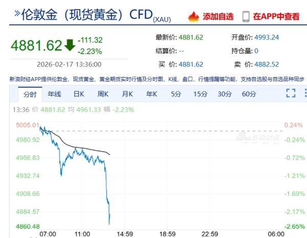2月17日,黄金、白银价格集体下跌。 截至下午13时30分,伦敦现货黄金价格报4881.62美元/盎司,下跌2.23%; 现货白银价格报73.14美元/盎司,下跌4.33%。 有分析认为,近期全球多个主要贵金属市场都因传统节日休市,贵金属市场交投清淡。此外,在美联储 降息预期有所降温的背景下,黄金在5000美元/盎司的关键心理关口遭遇阻力,叠加部分投资者获利了 结,加剧了贵金属价格的下行压力。 ...