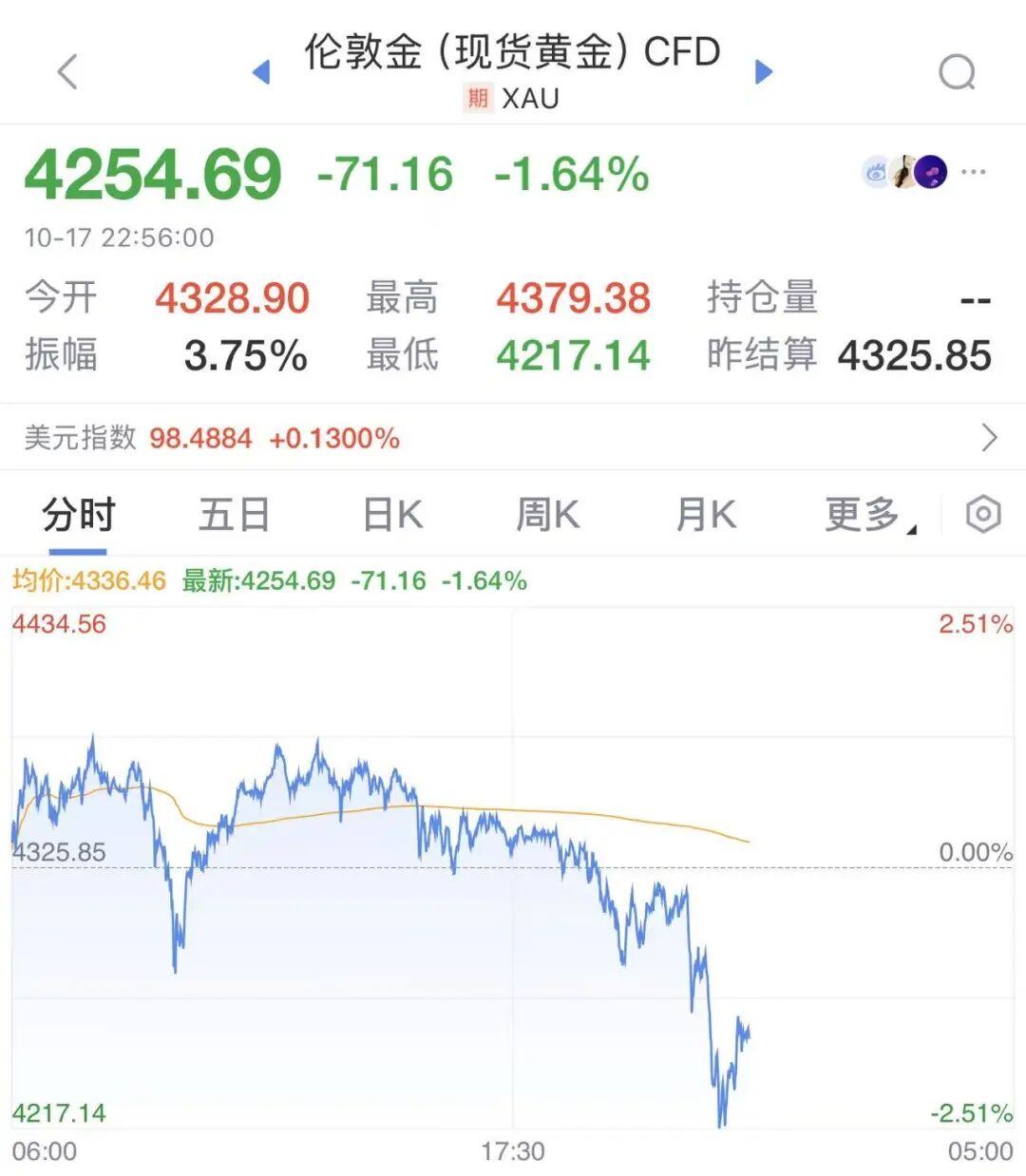 周五美盘交易时段,现货黄金在创下历史新高后大幅回落,跌破4200美元/盎司关口,日内大跌近130美元,跌幅达3%;现货白银日内大跌逾6%, 主要受美元走强及美国总统特朗普有关贸易局势的表态影响。 渣打银行全球大宗商品研究主管Suki Cooper表示:"我们预计2026年黄金价格将达到每盎司4488美元,并认为结构性因素仍可能推动价格进一步上 行。" 早盘时段,金价曾有望录得自2008年9月雷曼兄弟倒闭、引发全球金融危机以来的最大单周涨幅。 汇丰银行最新将其2025年黄金均价预测上调100美元至每盎司3455美元,并预计2026年金价将升至每盎司5000美元。 独立金属交易员Tai Wong表示:"自特朗普最初宣布征收100%关税后,其最新表态趋于缓和,这让市场对贵金属的避险需求有所降温。" Vital Knowledge分析师Adam Crisafulli在报告中指出:"我们认为银行业并不存在系统性信贷问题,目前的情况更多源自个别事件,而整体信贷质量 实际上比预期更好。" 黄金作为传统避险资产,今年以来已累计上涨逾62%,主要受到地缘政治紧张局势、各国央行的持续购金、资金从美元转向黄金以及黄金ETF强劲 流 ...