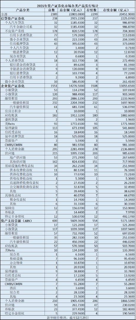 新华财经北京12月31日电(王菁)临近岁末,当年内发行规模升至22801.08亿元、产品数量达到2389只时,2025年的资产证券化市场交出了一份创近四年高 点、结构显著优化的成绩单。这不仅是数字上的增长,更是一场从信贷驱动转向实体服务、从单一产品到多元生态的深刻变革。 与总量一同跃升的,是市场结构的持续进化。企业资产证券化(企业ABS)以14276.5亿元的规模占据62.6% 的绝对主导份额;资产支持票据(ABN)则以 5609.36亿元的发行量和24.6%的占比,成为增长最快的引擎;而传统主力信贷资产证券化(信贷ABS)占比调整至12.8%。 | 产量分类 总数 总会额(亿元) 行线 双 | | 存续含额(亿元) | | | | | | | --- | --- | --- | --- | --- | --- | --- | --- | | 全部 2389 22801.0800 2299 | | 20451.9000 | | | | | | | 信贷资产证券化 238 2915.2200 237 | | 2225.0700 | | | | | | | 个人汽车贷款 32 1185.4300 32 | | 9 ...