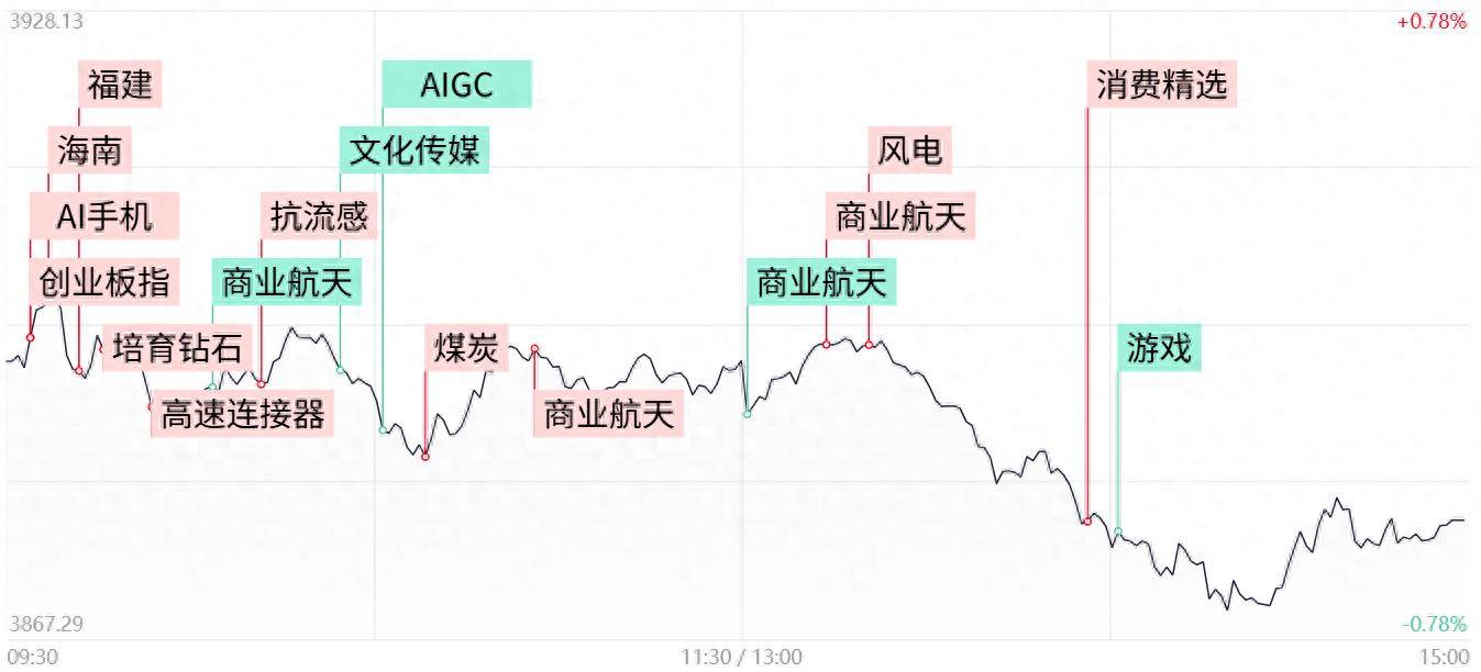Core Viewpoint - The market experienced fluctuations with the ChiNext Index dropping over 1% after an initial rise of more than 1% in the morning session, indicating a volatile trading environment [1] Market Performance - The total trading volume in the Shanghai and Shenzhen markets reached 1.67 trillion, an increase of 765 billion compared to the previous trading day [1] - Over 3,800 stocks in the market declined, reflecting a broad-based sell-off [1] Sector Performance - The superhard materials sector showed strong performance, with Huanghe Xunfeng hitting the daily limit [1] - The coal sector also performed well, with Antai Group achieving two consecutive limit-ups, and Dayou Energy and New Dazhou A both hitting the daily limit [1] - The wind power sector saw gains, with Dajin Heavy Industry and Delijia both reaching the daily limit [1] - The commercial aerospace concept surged in the afternoon, with Shunhao Co. achieving four consecutive limit-ups and Aerospace Machinery achieving two limit-ups in four days [1] Declining Sectors - The AI application sector collectively weakened, with Fushi Holdings and Yinsai Group experiencing significant declines [1] - The sectors with the highest gains included cultivated diamonds, coal, and wind power equipment, while AI applications and lithium mining sectors faced the largest declines [1] Closing Indexes - At the close, the Shanghai Composite Index fell by 0.51%, the Shenzhen Component Index decreased by 0.78%, and the ChiNext Index dropped by 1.12% [1]