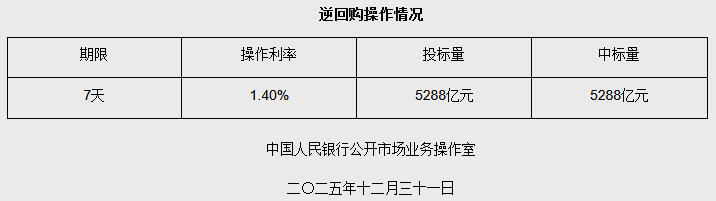 12月31日央行开展5288亿元7天期逆回购操作 中新网12月31日电 据央行网站消息,2025年12月31日中国人民银行以固定利率、数量招标方式开展了 5288亿元7天期逆回购操作。具体情况如下: | 逆回购操作情况 | | | | | --- | --- | --- | --- | | 期限 | 操作利率 | 投标量 | 中标量 | | 7年 | 1.40% | 5288亿元 | 5288亿元 | | 中国人民银行公开市场业务操作室 | | | | | 二〇二五年十二月三十一日 | | | | 图片来源:央行网站截图 来源:中国新闻网 编辑:张澍楠 广告等商务合作,请点击这里 本文为转载内容,授权事宜请联系原著作权人 中新经纬版权所有,未经书面授权,任何单位及个人不得转载、摘编或以其它方式使用。 关注中新经纬微信公众号(微信搜索"中新经纬"或"jwview"),看更多精彩财经资讯。 ...