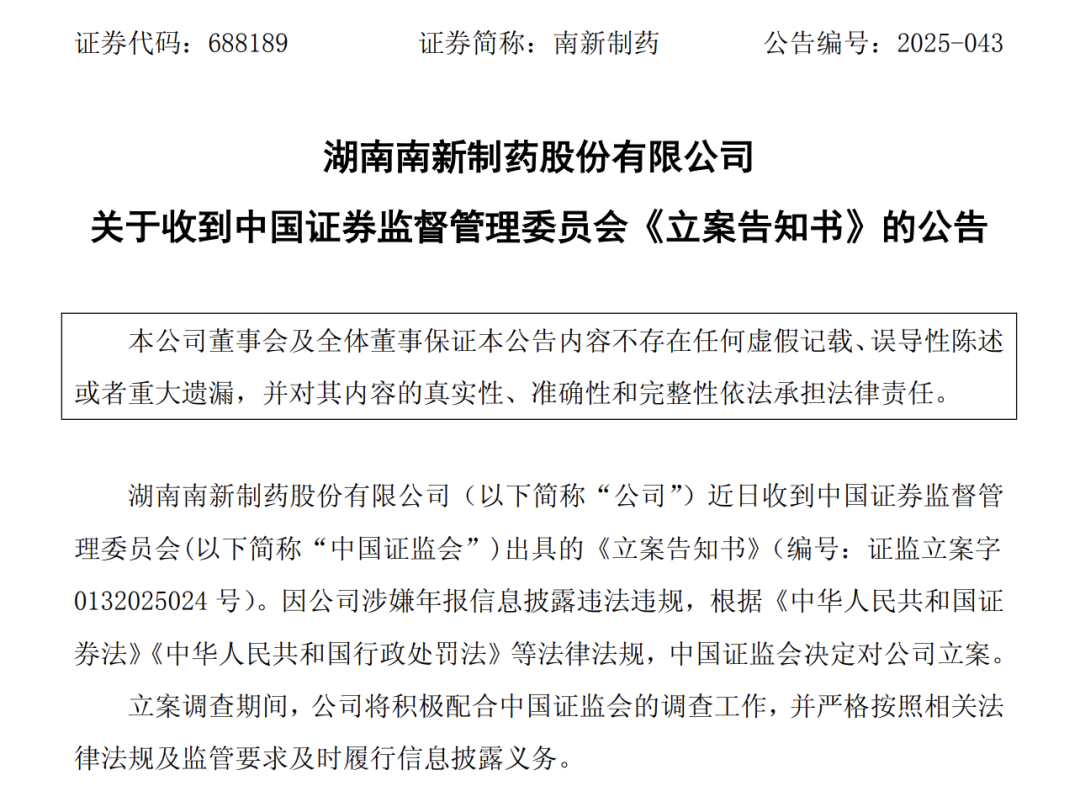 登录新浪财经APP 搜索【信披】查看更多考评等级 日前,南新制药(688189)公告,公司近日收到中国证监会出具的《立案告知书》,因公司涉嫌年报信息披露违法违规,证监会决定对公司立案。立案调 查期间,公司将积极配合中国证监会的调查工作,并严格按照相关法律法规及监管要求及时履行信息披露义务。 同日,南新制药公告称终止筹划重大资产重组事项。据南新制药公告,公司于2025年8月27日披露了《关于筹划重大资产重组暨签署<收购意向协议>的提 示性公告》,公司与西藏未来生物医药股份有限公司、许昌未来制药有限责任公司和合肥市未来药物开发有限公司(合称"未来医药")签署了《收购意向 协议》,公司拟以现金方式收购未来医药持有的标的资产组。根据初步研究和测算,此次交易预计构成重大资产重组情形。 今年8月27日,南新制药披露,拟收购未来医药持有的标的资产组,包括已上市标的品种"多种微量元素注射液(Ⅰ)""多种微量元素注射液(Ⅱ)"和在 研标的品种"多种微量元素注射液(Ⅲ)"以及所有相关所有权和知识产权。此次交易整体作价不超过4.8亿元。 南新制药表示,《收购意向协议》签署后,公司积极组织交易各方推进本次交易。公司与交易对方就本次交 ...