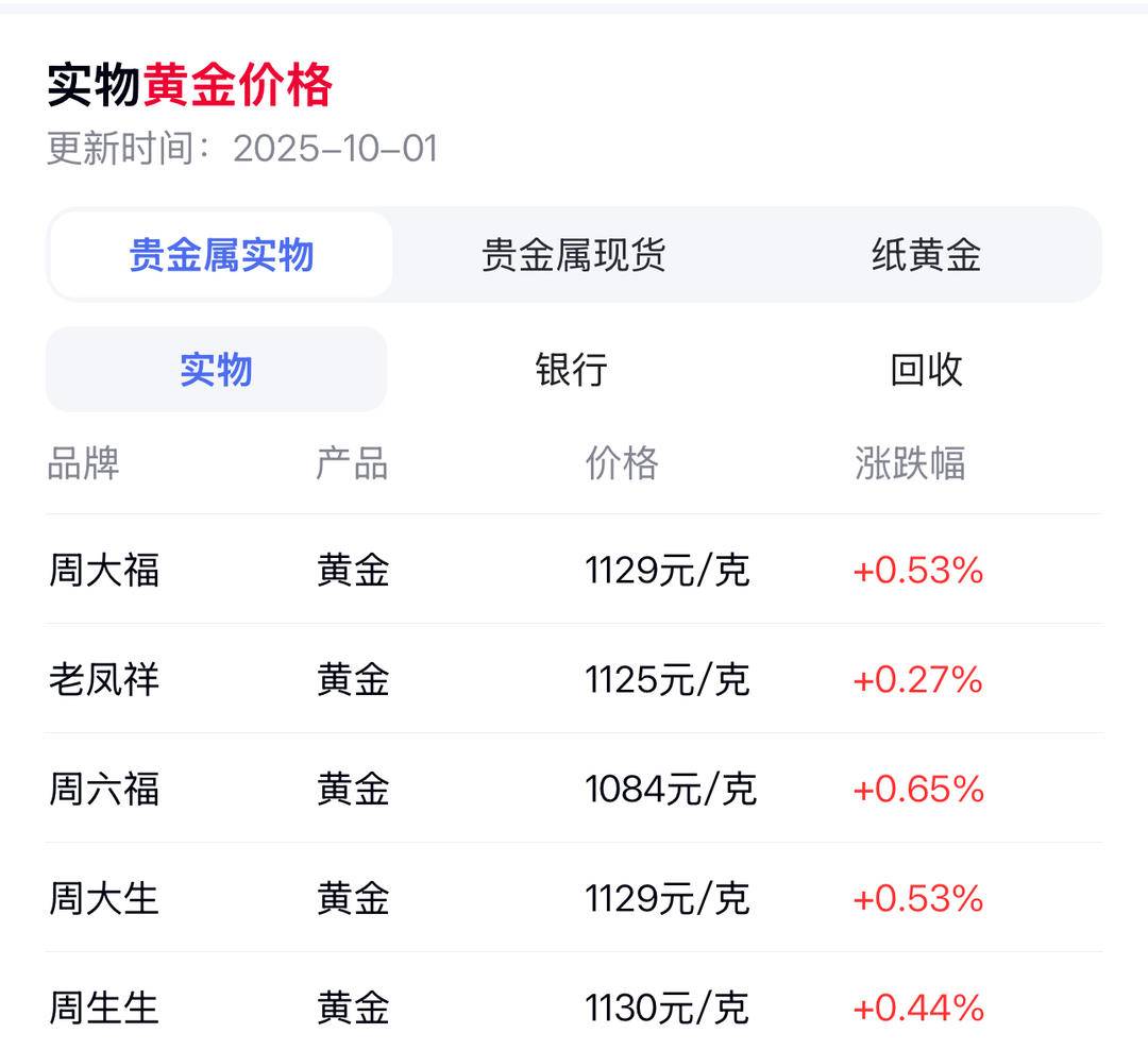 扬子晚报网10月1日讯(记者 范晓林 薄云峰)今天是国庆首日,国内主要金饰品价格继续攀高,克价1084至1130元不等。 今日金价显示,周六福克金1084元,老凤祥1125元,周大福1129元,周生生1130元,周大生1129元,比9月30日上涨0.27%-0.65%。 1日是国庆黄金周的首日,记者在南京河西一家商场的黄金专柜看到,高金价阻挡了消费者购金的热情。老凤祥金铺的柜姐热情地促销到,"今天有活动, 克金1007元。"记者在现场观察10分钟注意到,现场只有一名男性顾客和朋友在咨询。 在周生生专柜,柜姐说,"每克降70元,每克实价1055元"。 截至发稿时,纽约期金站上3900美元/盎司,日内涨0.7%。COMEX黄金一度站上3904美元/盎司。现货黄金向上触及3870美元/盎司,日内涨0.30%。 记者了解到,今年1月初与4月初,国际金价接连迎来两轮迅猛上涨行情,价格从年初的2600美元/盎司快速攀升至3400美元/盎司。9月以后,经历了4个月 3300美元/盎司左右的横盘后,9月2日现货黄金再次突破3500美元/盎司关口,并在9月6日冲上3600美元/盎司的历史新高。短短10日后的9月16日,伦敦现 ...