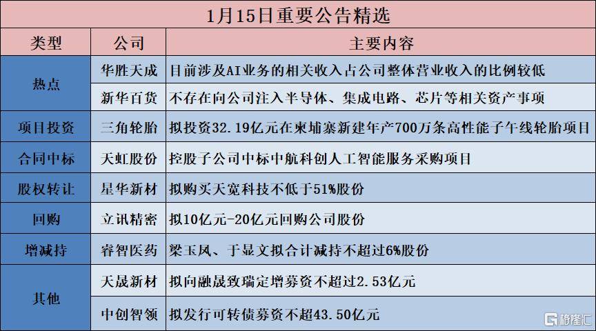| | | 1月15日重要公告精选 | | --- | --- | --- | | 类型 | 公司 | 主要内容 | | 热点 | 华胜天成 | 目前涉及AI业务的相关收入占公司整体营业收入的比例较低 | | | 新华百货 | 不存在向公司注入半导体、集成电路、芯片等相关资产事项 | | 项目投资 | 三角轮胎 | 拟投资32.19亿元在柬埔寨新建年产700万条高性能子午线轮胎项目 | | 合同中标 | 天虹股份 | 控股子公司中标中航科创人工智能服务采购项目 | | 股权转让 | 星华新材 | 拟购买天宽科技不低于51%股份 | | 回购 | 立讯精密 | 拟10亿元-20亿元回购公司股份 | | 增减持 | 容智医药 | 梁玉风、于显文拟合计减持不超过6%股份 | | 其他 | 天晟新材 | 拟向融晟致瑞定增募资不超过2.53亿元 | | | | 中创智领 拟发行可转债募资不超43.50亿元 号 簡隆運 | 【热点】 华胜天成(600410.SH):目前涉及AI业务的相关收入占公司整体营业收入的比例较低 新华百货(600785.SH):不存在向公司 注入半导体、集成电路、芯片等相关资产事项 人民网(603 ...