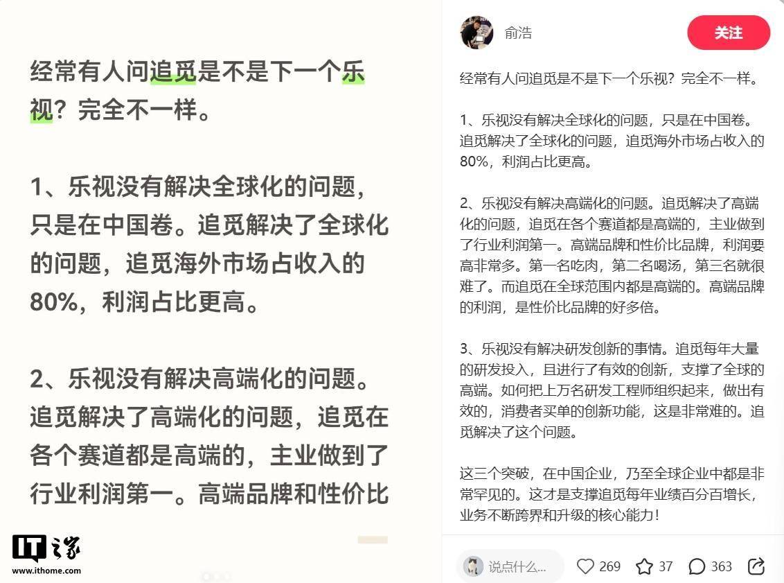 IT之家 1 月 27 日消息,追觅科技创始人兼 CEO 俞浩昨晚在社交媒体发布长文,表示经常有人问追觅是不是下一个乐视?俞浩称"完全不一样"。 1、乐视没有解决全球化的问题,只是在中国卷。追觅解决了全球化的问题,追觅海外市场占收入的 80%,利润占比更高。 3、乐视没有解决研发创新的事情。追觅每年大量的研发投入,且进行了有效的创新,支撑了全球的高端。如何把上万名研发工程师组织起来, 做出有效的,消费者买单的创新功能,这是非常难的。追觅解决了这个问题。 这三个突破,在中国企业,乃至全球企业中都是非常罕见的。这才是支撑追觅每年业绩百分百增长,业务不断跨界和升级的核心能力! 2、乐视没有解决高端化的问题。追觅解决了高端化的问题,追觅在各个赛道都是高端的,主业做到了行业利润第一。高端品牌和性价比品牌, 利润要高非常多。第一名吃肉,第二名喝汤,第三名就很难了。而追觅在全球范围内都是高端的。高端品牌的利润,是性价比品牌的好多倍。 IT之家注意到,俞浩在评论区中回应了裁员传闻,表示历史上整体裁员非常少,只有过一次,去年六七月,中国区人效太低,要提高人效。俞浩还称"核心 人员很稳定"。 那你们电商板块为啥裁员啊 昨天 19 ...