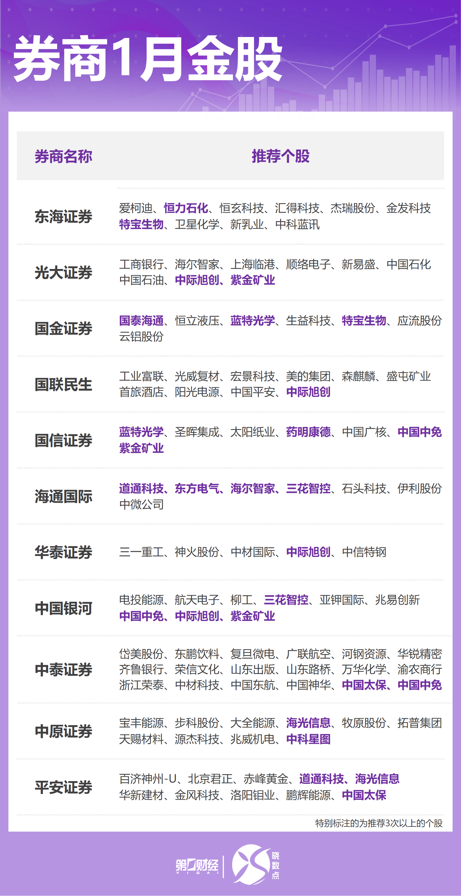 2026.01.02 作者 | 第一财经 漆辛夷 封图 | AI生成 2025年12月A股市场整体震荡走强,沪指累计涨2.06%,深证成指累计涨4.17%,创业板指累计涨 4.93%。1月如何寻找机会?截至发稿,10余家券商公布了1月月度投资组合,涉及金融、信息技术、消 费等多个领域。 | 券商1月 | 能 | | --- | --- | | 券商名称 | 推荐个股 | | 东海证券 | 爱柯迪、恒力石化、恒玄科技、汇得科技、杰瑞股份、金发科技 特宝生物、卫星化学、新乳业、中科蓝讯 | | 光大证券 | 工商银行、海尔智家、上海临港、顺络电子、新易盛、中国石化 中国石油、中际旭创、紫金矿业 | | 固命证券 | 国泰海通、恒立液压、蓝特光学、生益科技、特宝生物、应流股份 云铝股份 | | 国联展生 | 工业富联、光威复材、宏景科技、美的集团、森麒麟、盛屯矿业 首旅酒店、阳光电源、中国平安、中际旭创 | | 国信证券 | 蓝特光学、圣晖集成、太阳纸业、药明康德、中国广核、中国中免 器等处,不 | | 海通国际 | 道通科技、东方电气、海尔智家、三花智控、石头科技、伊利股份 中微公司 | | --- | --- ...