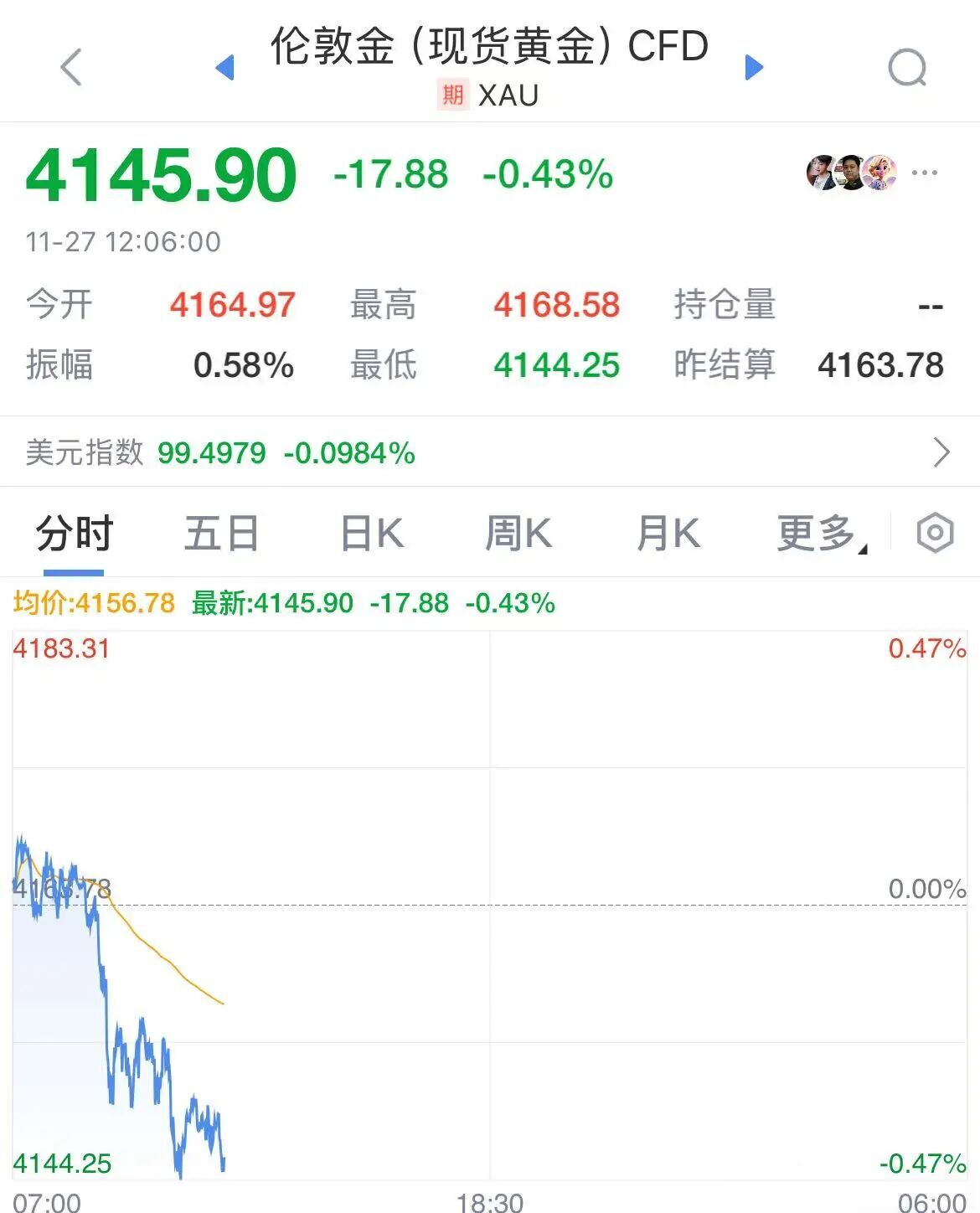 Core Viewpoint - The recent fluctuations in gold prices are influenced by economic indicators and expectations regarding the Federal Reserve's monetary policy, with a notable decline in gold prices observed on November 27, 2023, following a previous rise. Group 1: Gold Price Movements - On November 27, 2023, spot gold prices fell to $4145.9 per ounce, down 0.43% from previous levels [1] - The price of gold had previously reached a high of $4163.78 per ounce, marking a 0.8% increase, with an intraday peak of $4173.31 [8] - Concurrently, spot silver prices also declined, falling below $53 per ounce [8] Group 2: Economic Indicators - The Federal Reserve's "Beige Book" report indicated a decline in overall consumer spending and signs of weakness in the job market, influenced by AI technology and rising costs due to tariff policies [10] - Central banks are reportedly reducing their gold holdings as some have exceeded their target ratios of gold to reserve assets, although the overall allocation of gold by global central banks may still increase [10] Group 3: Market Expectations - There is a growing expectation that the Federal Reserve will implement interest rate cuts in December, with predictions of a 25 basis point reduction [12] - Major investment banks, including JPMorgan and Goldman Sachs, have raised their gold price forecasts, with JPMorgan predicting gold could reach $4500 per ounce by mid-2026 and Goldman Sachs adjusting its target for Q1 2026 to $4440 per ounce [12][13]