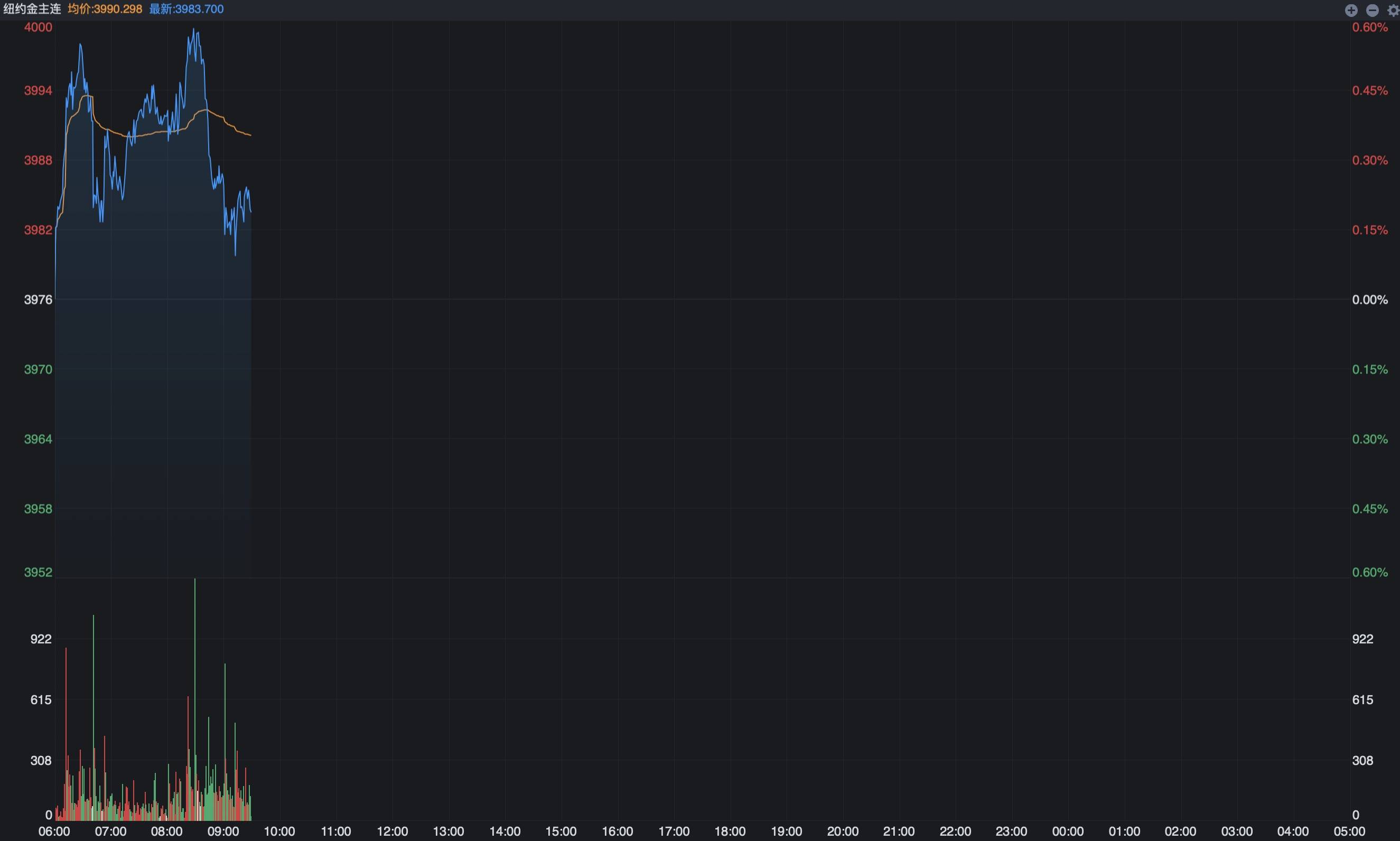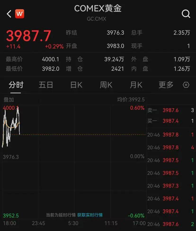 10月7日,COMEX黄金历史首次突破每盎司4000美元关口,年内大涨逾50%,随后稍有回落。现货黄金今日一度涨至 3977美元/盎司,同样创下历史新高。 | W | COMEX黄金 | | | | | | | | --- | --- | --- | --- | --- | --- | --- | --- | | | GC CMX | | | | | | | | 3931 | | | 3976.3 | 总手 | | 2.35万 | | | +11.4 | +0.29% 开盘 | | 3983.0 | 现手 | | 1 | | | 最高价 | 4000.1 | 在 色 | 39.24万 | Ar | | 1.09万 | | | 最低价 | 3982.0 | 搜 色 | 2421 | 内 | | 1.26万 | | | 分时 | ね日 | EK | 高K | 月K | 中文 | | | | ■加 | | | | 均价:3992.5 | | | | | | | | | 0.60% | 3987.6 | | 3 | | | | | | | 3987.4 | | 1 | | | | | | | 20:46 3987.8 ...