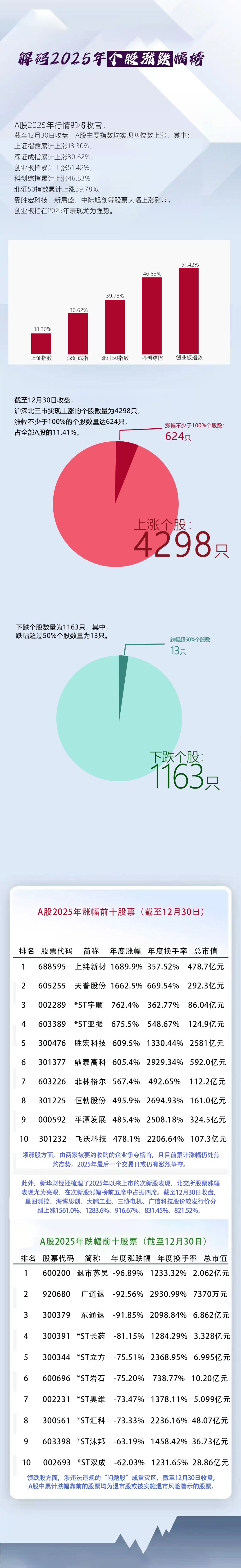 解码2025年个股涨跌幅榜 A股2025年行情即将收官, 截至12月30日收盘,A股主要指数均实现两位数上涨,其中: 上证指数累计上涨18.30%, 深证成指累计上涨30.62%, 创业板指累计上涨51.42%, 科创综指累计上涨46.83%, 北证50指数累计上涨39.78%。 受胜宏科技、新易盛、中际旭创等股票大幅上涨影响, 创业板指在2025年表现尤为强势。 51.42% 46.83% 39.78% 30.62% 18.30% A股2025年跌幅前十股票(截至12月30日) 科创综指 上证指数 北证50指数 创业板指数 深证成指 截至12月30日收盘, 沪深北三市实现上涨的个股数量为4298只, 涨幅不少于100%的个股数量达624只, 涨幅不少于100%个股数: 占全部A股的11.41%。 624只 a | 排名 股票代码 简称 年度涨跌幅 年度换手率 总市值 | | --- | | 1 600200 退市苏吴 -96.89% 1233.32% 2.062亿元 | | 2 920680 广道退 -92.56% 2930.99% 7370万元 | | 3 300379 东通退 -91.85% 2098. ...