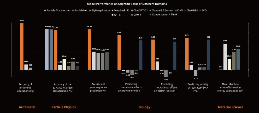 GPT-5,DeepSeek 这些大语言模型能不能直接执行 Alphafold 这样的专业科学任务?OpenAI 的 Sam Altman 在多个场合提到,ChatGPT 的主要目标是建造 基于语言的通用推理机器 (General Reasoning Machine), 再使用推理机器来调用专业科学模型如 Alphafold 解决特定科学问题,所以无法也没必要用 ChatGPT 直接执行 Alphafold 的任务。 近日,专注于研发物质世界基座模型的公司超越对称(上海)技术有限公司(超对称)发布了新版基座模型 BigBang-Proton,成功实现多个真实世界的专 业学科问题与 LLM 的统一预训练和推理,挑战了 Sam Altman 和主流的 AGI 技术路线。 BigBang-Proton 的结果展示,不仅 Alphafold,AlphaGenome 这样的专业生物问题,横跨所有物质尺度从微观粒子夸克、材料晶格到 DNA 蛋白质到宏观地 球系统的科学问题都可以整合在同一个自回归 LLM 上用 next-word-prediction 的范式来完成预训练和推理。 同时,BigBang-proton 实验结 ...