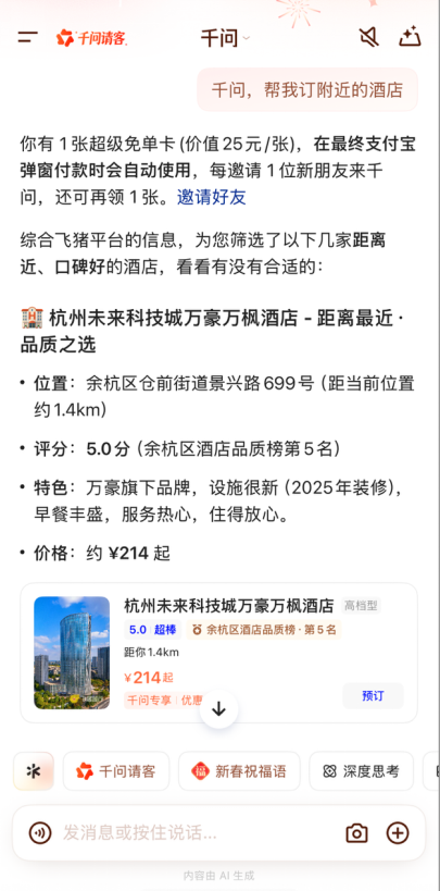 Core Insights - The "Qianwen Help Me Book Hotel" service has rapidly gained popularity, driven by festive atmosphere and AI benefits, with a significant increase in orders for hourly rooms in county towns by approximately 300% [1] Group 1: Service Overview - The newly launched "Super Invitation Card" is priced at 25 yuan and covers a wide range of services including dining, New Year goods, movie tickets, hotels, flight tickets, and scenic area tickets [1] - Users can simply request "Help me book a nearby hotel" in the Qianwen app, which will automatically filter options, allowing users to confirm details and make payment without leaving the app [1] Group 2: Market Impact - Following the introduction of the "Super Invitation Card," there has been a notable increase in demand for hotel bookings through Qianwen, particularly for hourly rooms in county towns, with the booking ratio surging by about 300% [1] - The average booking price for hourly rooms in county towns, after using the 25 yuan card, ranges from approximately 15 yuan to 30 yuan [1] - Data from the "Spring Festival 3 Billion Big Free Order" campaign indicates that nearly half of Qianwen's orders were placed in county towns, highlighting the platform's growing influence in these markets [1]
