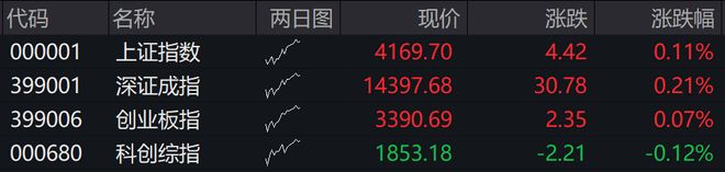 09:25 A股开盘丨三大指数集体高开 沪指高开0.11%,深成指高开0.21%,创业板指高开0.07%,科创综指低开0.12%。 | 代码 | 名称 | 两日图 | 现价 | 涨跌 | 涨跌幅 | | --- | --- | --- | --- | --- | --- | | 000001 | 上证指数 | W/ | 4169.70 | 4.42 | 0.11% | | 399001 | 深证成指 | NA | 14397.68 | 30.78 | 0.21% | | 399006 | 创业板指 | 3 | 3390.69 | 2.35 | 0.07% | | 000680 | 科创综指 | No | 1853.18 | -2.21 | -0.12% | 2026.01.13 本文字数:596,阅读时长大约1分钟 作者 |一财阿驴 09:30AI应用方向延续强势,引力传媒7天6板,易点天下、卓易信息、迪安诊断、利欧股份、省广集团 均3连板。 恒生指数高开1.32%,恒生科技指数涨1.93%。科网股全线走强,阿里巴巴、阿里健康涨近5%,小鹏汽 车涨逾4%,金蝶国际、比亚迪股份涨逾3%。兆易创新H股上市高开45 ...