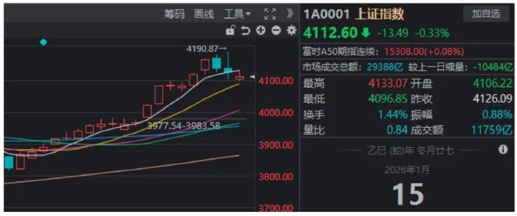 每日经济新闻消息,1月15日,三大指数涨跌不一,沪指盘中一度跌破4100点,创业板指午后探底回升。 截至收盘,沪指跌0.33%,深成指涨0.41%,创业板指涨0.56%。 板块来看,半导体板块午后走强,CPO概念震荡拉升,旅游酒店板块表现活跃,有色金属板块走高。下跌 方面,AI应用、商业航天等板块跌幅居前。高位人气股集体退潮。 全市场超3100只个股下跌。沪深两市成交额2.91万亿元,较上一个交易日缩量1.04万亿。 今天,A股的大主题仍是"降温"。 具体而言,商业航天也好,AI应用也罢,近期越是"过热"的板块、个股,出现回调的概率和幅度也越大。 这与昨日(周三)"降杠杆+巨额压单"的组合拳显然有直接关系,市场各方对此应有一定共识。 而主要的分歧,在于对市场调整空间、方向的预判,比如: (1)指数能跌到哪里? Wind数据显示,截至收盘,沪指守住4100点关口,但失守5日线、接近10日线;深成指、创业板指午后翻 红。 但也不必太过悲观。今天尾盘,多只宽基ETF持续放量,如中证500ETF成交超263亿创历史新高。这意味 着大资金其实有意托市。 另一方面,盘后立刻有利好传来。据报道,人民银行新闻发言人、副行长邹 ...