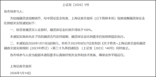 值得关注的是,此次调整仅限于新开融资合约,调整实施前已存续的融资合约及其展期仍按照调整前的 相关规定执行。 回溯A股市场融资保证金比例的演变历程,其调整始终与市场调控需求紧密相关。2006年8月,沪深交 易所推出融资融券交易试点实施细则,明确融资保证金比例不低于50%,彼时市场最高可实现两倍杠杆 交易;2015年11月,为抑制两融余额过快上涨、防范融资交易过热引发的市场风险,交易所将该比例上 调至100%;2023年8月,结合市场环境变化,沪深北交易所又将融资保证金比例从100%降低至80%。 华创金融分析师徐康指出,融资保证金比例是监管层表达观点和实施逆周期调节的重要工具,此次调整 的核心目标是引导市场向长牛、慢牛格局发展。 1月14日,沪深北交易所同步发布通知,宣布调整融资保证金比例,将投资者融资买入证券时的融资保 证金最低比例从80%提高至100%。 业内普遍认为,监管层始终遵循"市场冷时松、市场热时紧"的调节逻辑,通过精准调控引导市场预期回 归理性,避免因投机过度导致市场大起大落。有业内人士评价,此次调整相当于监管层给"快牛"踩刹车 了。这并非要扼杀牛市,而是意在通过杠杆调节,推动市场从"资金推动型" ...