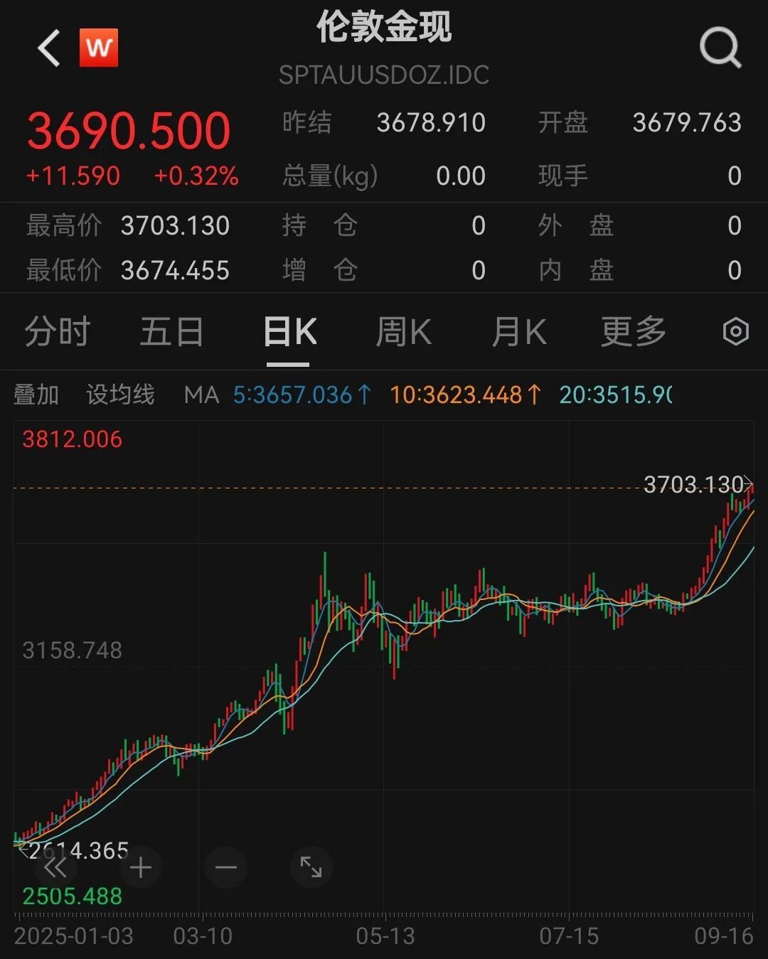 美联储宣布降息后,现货黄金刷新纪录高位至3704美元/盎司,突破前高3703.1美元/盎司