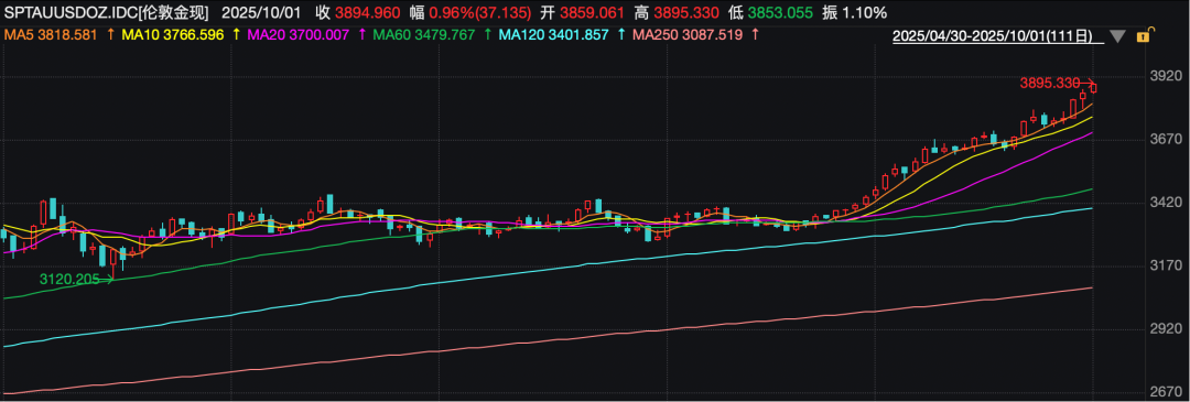 【导读】现货黄金站上3890美元/盎司,国内金饰价格达1130元/克 国庆第一天,金价又双叒叕大涨! 10月1日,现货黄金短线拉升,站稳3890美元/盎司大关。截至记者发稿,伦敦金现最高价突破3895美元/盎司,再创历史新高。 COMEX黄金同步拉升,日内涨超1%,截至发稿报3920.2美元/盎司。 消息面上,近期美国政府"停摆"消息引发避险需求。美国总统特朗普周一与两党国会高层会面,协商延长政府拨款事宜。若国会无法在最后期限前通过临 时拨款法案,部分联邦机构将被迫停摆,数十万联邦雇员将被迫无薪休假,美国经济数据的发布也将受到影响。 此前曾被戏称为"黄金刺客"的一口价产品,反而成为"保值神器"。近期,国内多家主流珠宝品牌的"一口价"黄金饰品陆续启动涨价,周大福、潮宏基、周 生生等品牌已开始或即将上调相关产品价格。 亦有市场人士认为,黄金市场近期最强劲的推动力,来自美联储降息预期的持续发酵。上周五公布的美国个人消费支出物价指数恰好符合市场预期,这 份"不温不火"的数据反而让投资者吃下定心丸——通胀既未失控也未降温,为美联储实施降息提供了恰到好处的空间,市场对10月和12月连续降息的预期 已升至高点。 金饰价格方 ...