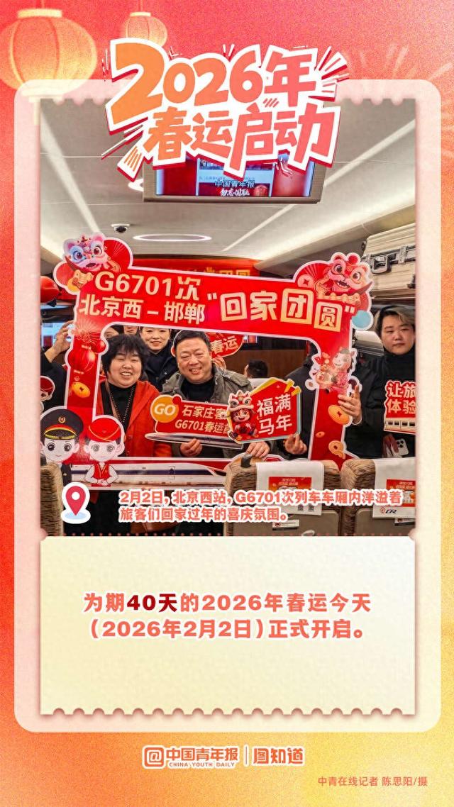 2月2日,为期40天的春运拉开帷幕。据预测,今年春运期间全社会跨区域人员流动量将达95亿人次。从 北国雪原到南疆海岸,从西部边陲到东海之滨,流动的中国正以蓬勃的活力绘制着世界上最壮观的迁徙 图景。在这场世界最大规模的人口流动中,我们既看到游子归乡的迫切脚步,也见证了中国经济社会的 强劲脉动。愿所有奔赴都平安抵达,所有等待都温暖相拥。 0 中国青年报 | | 图片道 中青在线记者 陈思阳/摄 月2日,铁路太仓站举行的书法家现场书法送 福贺法律咨询服务示讲座录文艺演出,工会 企惠民服务等活动,为旅客送上平安祝福。 综合研判,今年春运全社会跨区域人 品流动量将达95亿人次。预计创历史 新高。 @黒国青年線 | 图片来源/视觉中国 .. . . . . . . . 日体验卡, 44 C位就是我! e 春运百日 首趟车乘客! 2月2日,北京西站,候车室内旅客排队等候检票。 2026年2月2日(春廷第1大,农历 腊月十五),预计全社会跨区域人 员流动量18791万人次,比2025 年同期(春运第1天)增长13%。 中国青年报 ||图知道 中青在线记者 陈思阳/摄 FBE 201 HO : FA 自驾出行仍将是主体方式,占 ...