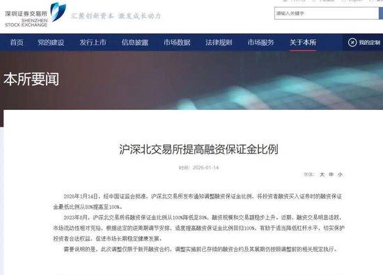 2026年1月14日,经中国证监会批准,沪深北交易所发布通知调整融资保证金比例,将投资者融资买入证券时的融资保证金最低比例从80%提高至100%。 2023年8月,沪深北交易所将融资保证金比例从100%降低至80%,融资规模和交易额稳步上升。近期,融资交易明显活跃,市场流动性相对充裕,根据法定的逆周 期调节安排,适度提高融资保证金比例回归100%,有助于适当降低杠杆水平,切实保护投资者合法权益,促进市场长期稳定健康发展。 看券商中国 知天下财经 弊中社 券商中国 X 券中社 扫码下载 券 中 社 A P P 扫码关注券商中国公众号 quanshangcn qzs.stcn.com 券中社APP 券 商 中 国 是 证 券 市 场 权 威 媒 体 《 证 券 时 报 》 旗 下 新 媒 体, 券 商 中 国 对 该 平 台 所 刊 载 的 原 创 内 容 享 有 著 作 权 , 未 经 授 权 禁 止 转 载 , 否 则 将 追 究 相 应 法 律 责 任 。 综合自:沪深北交易所 责编:王璐璐 校对:许欣 百万用户都在看 "降息大门关闭!"美联储,预期突变! 最高猛增520%!A股批量晒出超级"战报",一晚7 ...