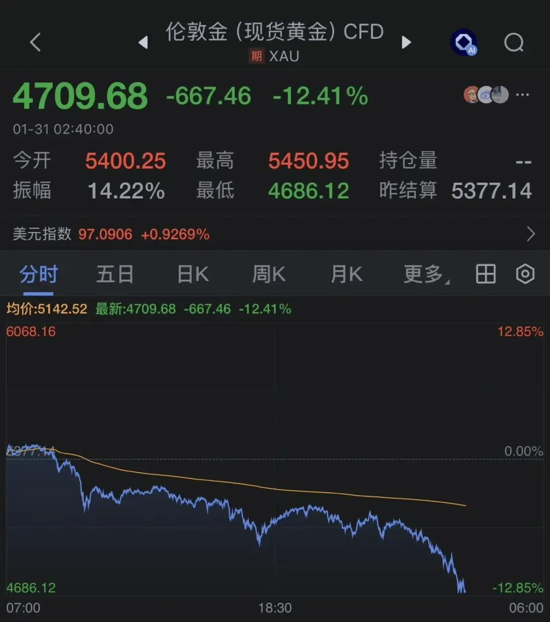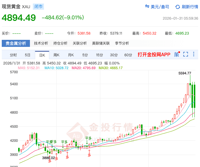 1月31日,国际金银价格同步大跌,创40余年来最大跌幅。国内金饰价格同样明显下跌,多家品牌金饰克价重回1500~1600元区间。 专家分析,这轮下跌的核心诱因是美联储释放降息延后信号及人事变动,叠加获利盘集中出逃,形成恐慌性抛售。 北京时间1月31日,现货黄金收盘价为4894.49美元/盎司,跌幅超过9%,一夜跌回1月21日的价格,盘中一度跌破4700美元。白银收盘价84.63美元/盎司,大 跌近27%,最低跌至77.7美元。 ▲菜百首饰展示的最新金价 中国商业经济学会副会长、华德榜创始人宋向清告诉红星新闻记者,今日金银出现历史级暴跌,核心诱因是美联储释放降息延后信号且人事变动推升美元与 高利率预期,直接削弱贵金属避险和持有价值。宋向清还提到,前期金银受投机资金推动涨幅过大,交易所上调保证金触发高杠杆资金平仓,叠加获利盘集 中出逃,形成恐慌性抛售循环放大跌幅。本轮金银上涨缺乏基本面供需支撑,白银的金融与工业双重属性进一步加剧下跌,贵金属相关板块同步重挫,资金 转向美元、美债等资产。 ▲1月31日,国际金价暴跌9% ▲1月30日,消费者在菜百首饰试戴金饰 图据视觉中国 1月30日,在金价已经出现大幅波动的情况下 ...