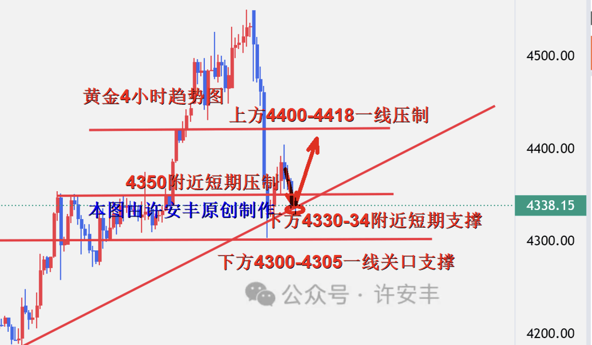 黄金具体行情思路: 方案一:金价回踩4330-4336区间布局多,回撤4320-23附近补仓多,损点4311附近,方向4380-4385区间内,破位看4400-4418区间附近。 注:以上文章由许安丰原创,转载请注明出处。许安丰温馨提示,投资有风险,入市需谨慎。 黄金自3886美元低点反抽后,首轮止步4245美元,第二轮冲高至12月1日承压4265美元,未出现预期二次下跌,多重利多推动下转为震荡整理,本轮调整仅 以价格震荡完成,未达理想回落位,我们没有抓到很低的价格,做上了末班车。但短期上车成本不影响长期看涨逻辑,当前黄金主升核心支撑依然明确:全 球央行持续购金、地缘局势扰动、美联储降息周期延续及全球经济弱复苏,底层逻辑未变则看涨根基不动。2026年我们坚定看好两轮上涨行情,2026上半 年:金价有望冲击5000-5100美元,对应国内金价目标1160-1200,整体上半年延续强势上涨格局。 黄金今天开盘在4332一线,最低回踩至4328一线反弹,我们在盘也是直接给了4330-34附近的多单,目前黄金已经反弹4353附近震荡,早盘虽有回调,但是 多头趋势依旧没有本质的发生变化,回踩不破继续做多,小时线指标平缓 ...