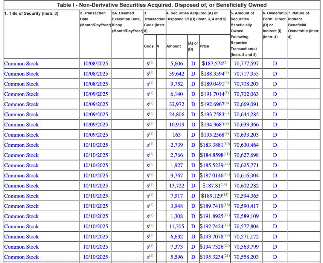 Group 1 - Nvidia's CEO Jensen Huang sold 225,000 shares of the company's stock between October 8 and 10, cashing out over $42.8 million [1] - Huang had previously sold 75,000 shares from October 1 to 7, totaling over $70.24 million [2] - Cumulatively, Huang has cashed out over $113 million from stock sales in October alone [3] Group 2 - As of October 10, 2025, Huang still holds over 70.6 million shares of Nvidia stock [4] - Nvidia's stock price has increased by over 36% this year, outperforming the Nasdaq Composite Index's 14.98% gain [5] - On October 9, Nvidia's stock reached a record high of $195.62 per share, with a market capitalization peaking at $4.73 trillion [5][6] Group 3 - On October 10, Nvidia's stock price fell by 4.89%, resulting in a market value loss of approximately $228.66 billion, equivalent to about 1.63 trillion RMB [6] - The latest closing price was $183.16 per share, with a market capitalization of $4.45 trillion [6]
