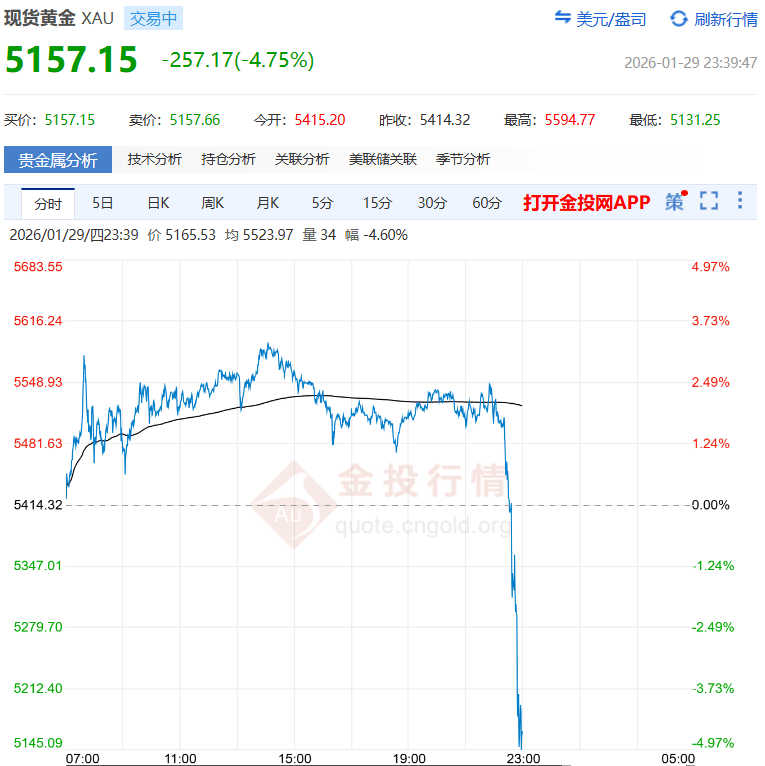 1月30日,黄金白银在经历大幅快速上涨后出现暴跌,原因是什么?长期看金价和白银价格走势将如何?1月30日,扬子晚报/紫牛新闻记者采访了机构分 析师。 | < ロ | 伦敦金现 | | | | | | --- | --- | --- | --- | --- | --- | | | SPTAUUSDOZ.IDC | | | | | | 5187.545 | | 昨结 5377.160 | 开盘 5390.563 | | | | -189.615 -3.53% | | 总量(kg) 0.00 | 现手 | | 0 | | 最高价 | 5451.010 | 0 持 仓 | 外 盘 | | O | | 最低价 | 5111.960 | 增 仓 0 | 内 盘 | | 0 | | 分时 | 売日 日日K 周K 月K 更多 | | | | | | 督加 | | | 均价: -- 盘口 | | | | 5642.360 | | | 4.93% 卖1 5188.549 0 | | | | | | | 买1 5187.300 0 | | | | | | | 14:15 5188.970 0 | | | | 99 1 Nu | | ...