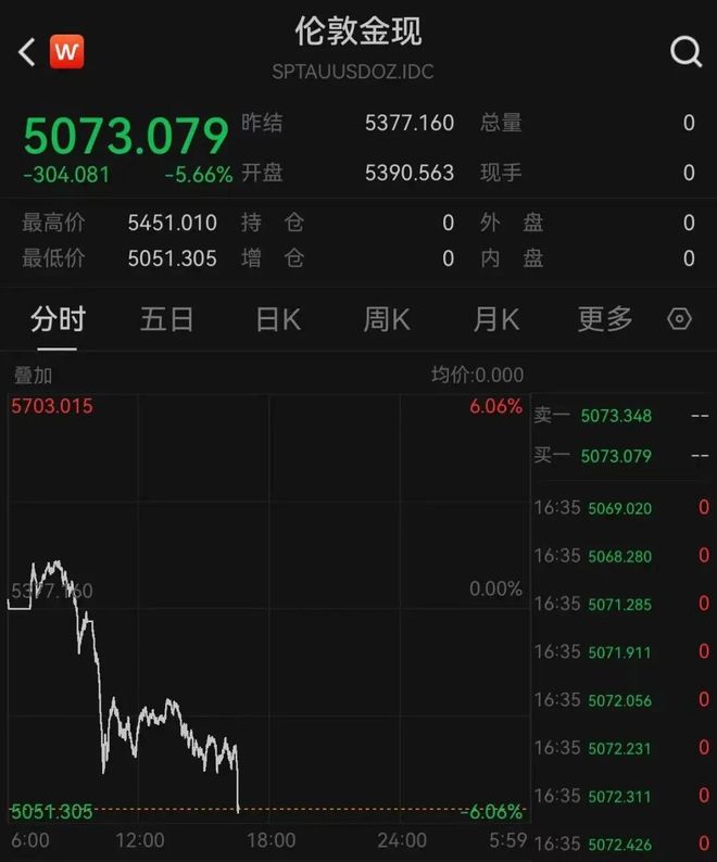 编辑|钉钉 1月30日, 现货黄金、白银持续下挫。截至发稿, 现货黄金跌超5%,失守5100美元/盎司关口。现货白 银跌超10%,报103.518美元/盎司。 | < W | | | 伦敦金现 | | | | | | | --- | --- | --- | --- | --- | --- | --- | --- | --- | | | | | SPTAUUSDOZ.IDC | | | | | | | 5073.079 *** | | | 5377.160 | | | 总量 | | 0 | | -304.081 | -5.66% 六盘 | | | 5390.563 | | 现手 | | 0 | | 最高价 | 5451.010 | 持 仓 | | | 0 | 4 智 | | 0 | | 最低价 | 5051.305 | 播 仓 | | | 0 | 内 | | 0 | | 分时 | 五日 | EK | 園K | | | 月K | 白云 | | | 鹽加 | | | | | 均价:0.000 | | | | | 5703.015 | | | | | | 6.06% - 5073.348 | | | | | | | ...