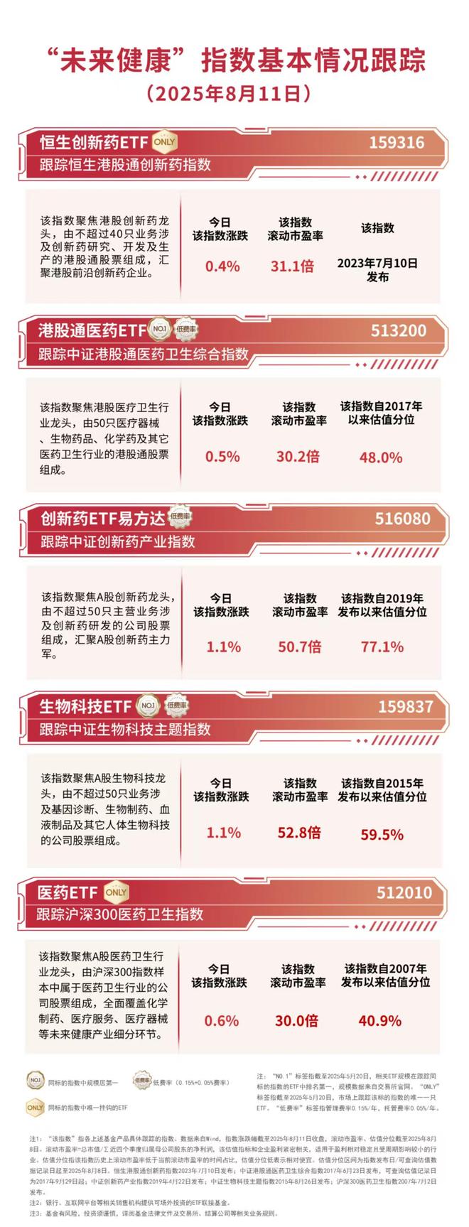 截至收盘,中证创新药产业指数、中证生物科技主题指数均上涨1.1%,沪深300医药卫生指数上涨 0.6%,中证港股通医药卫生综合指数上涨0.5%,恒生港股通创新药指数上涨0.4%。据Wind数据,恒生 创新药ETF(159316)今日成交额超4亿元,获1000万份净申购。 今日,恒生港股通创新药指数编制方案修订实施,明确剔除CXO企业,聚焦创新药企,成为ETF跟踪指 数中首批"纯度"100%的创新药指数。回测显示,此次调整后,该指数自2023年7月10日指数发布以来年 化收益率达47%,夏普比率也更高。 注2:银行,互联网平台等相关销售机构提供可场外投资的ETF联接基金。 注3:基金有风险,投资须谨慎,详阅基金法律文件及交易所、结真公司等相关业务规则, | 组以,汇聚A胶则制约土/ 三。 | 1.1% | 50.7倍 | 77.1% | | --- | --- | --- | --- | | 生物科技ETF(NOJ | | | 159837 | | 跟踪中证生物科技主题指数 | | | | | | | | ··· /////////// | | 该指数聚焦A股生物科技龙 | 令日 | 12:157 | 该指数自 ...