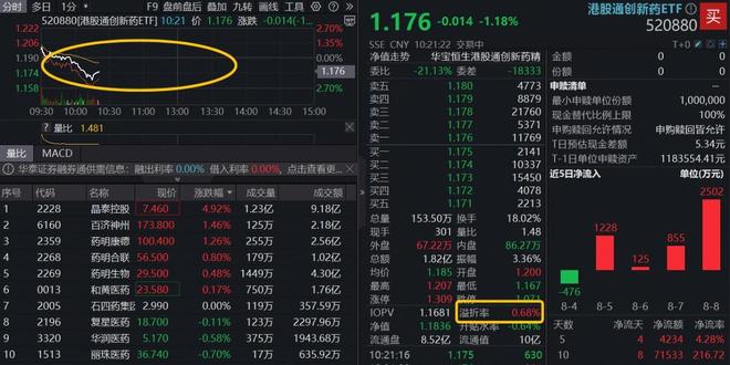 8月11日,创新药连续第3日回调,创新药"新势力"港股通创新药ETF(520880)场内价格一度跌近 2%,现跌1.18%,盘中持续宽幅溢价,实时溢价率0.68%,显示买盘资金逢跌积极介入。 拉长时间看,港股通创新药ETF(520880)持续吸金,上交所数据显示,其近4日连续获资金净流入合 计4710万元,近10日资金更是累计增仓7.15亿元。 | 分时 多日 1分 · | | | | | F9 盘前盘后 叠加 九砖 画线 工具 (2 >> | | | | | | 港股通创新药ETF O 37 | | | --- | --- | --- | --- | --- | --- | --- | --- | --- | --- | --- | --- | --- | | 13222 | | | | 520880[港股通创新药ETF] 10:21 价 1.176 涨跌 -0.014(-1 -- 2.70% | | E | | 1.176 -0.014 -1.18% | | | | N 520880 | | 1.206 | | | | | | 135% | | SSE CNY 10:21:22 交易中 | | | | T ...