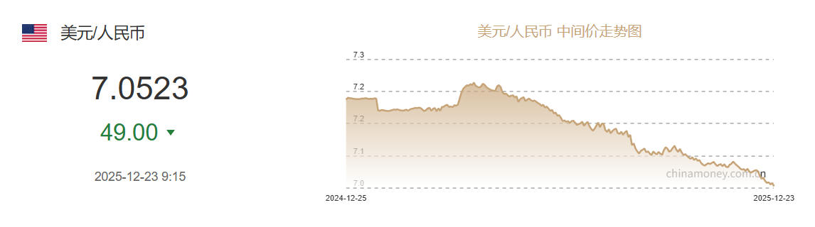 12月23日人民币对美元中间价报7.0523 上调49个基点
