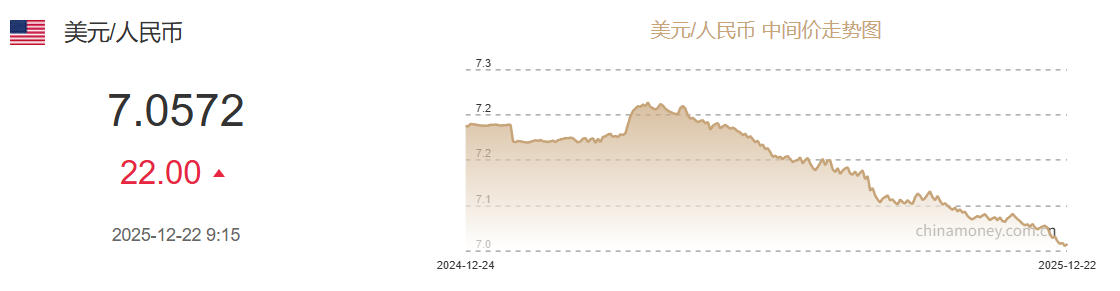 图源:中国外汇交易中心网站截图 本文为转载内容,授权事宜请联系原著作权人 来源:中国新闻网 编辑:郭晋嘉 12月22日人民币对美元中间价报7.0572 下调22个基点 广告等商务合作,请点击这里 中新网12月22日电 据中国外汇交易中心网站消息,中国人民银行授权中国外汇交易中心公布,2025年12月22日银行间外汇市场人民币汇率中间价为:1美元 对人民币7.0572元,下调22个基点。 中新经纬版权所有,未经书面授权,任何单位及个人不得转载、摘编或以其它方式使用。 关注中新经纬微信公众号(微信搜索"中新经纬"或"jwview"),看更多精彩财经资讯。 ...