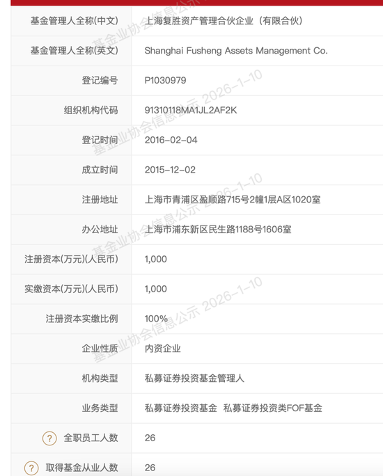 私募开年迎"爆款" 近日,记者从业内人士处获悉,复胜资产在某私人银行渠道的新发规模单日便达到10亿元,投资者"抢 号"的速度也较快。 据公开资料,复胜资产成立于2015年,管理规模超过100亿元。其董事长陆航在接受记者采访时表示, 今年资本市场的机会很大。具体来看,一方面经济逐渐企稳,很多边际改善的迹象正鼓舞着投资者的信 心,企业盈利也逐步显现改善趋势;另一方面,国内科技创新成果持续显现,AI技术对于传统行业的 重塑也屡见不鲜,接下来公司将聚焦新消费(AI+以及新型消费品)、有色金属以及部分传统中游行业 (如化工等)的机会,沿着"时代增量"和"供需错配"两个逻辑出发,寻找优质资产。 | 基金管理人全称(中文) | 上海复胜资产管理合伙企业(有限合伙) | | --- | --- | | 基金管理人全称(英文) | Shanghai Fusheng Assets Management Co. | | 登记编号 | P1030979 | | 组织机构代码 | 91310118MA1JL2AF2K | | 登记时间 | 2016-02-04 | | 成立时间 | 2015-12-02 | | 注册地址 | 上海市青 ...