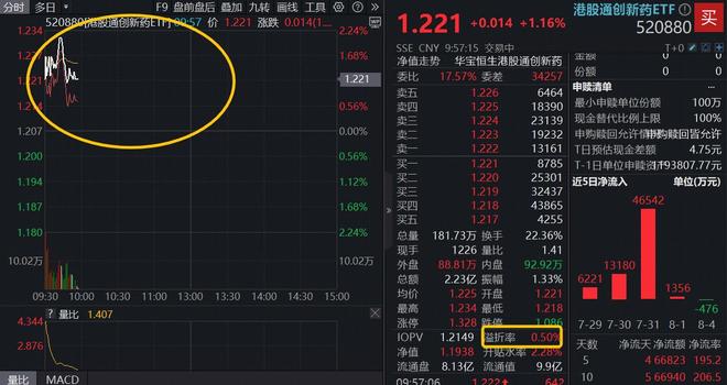 8月5日,港股早盘高开,创新药"新势力"港股通创新药ETF(520880)场内价格一度涨近2%,现涨 1.16%,再现宽幅溢价,实时溢价率达0.5%,显示买盘资金信心颇足。 | 序号 | 代码 | 名称 | 两日图 | 现价 | 涨跌 | 涨跌幅 | | --- | --- | --- | --- | --- | --- | --- | | 1 | 6852 | 亚盛医药 - B | 1005 | 76.800 | 3:450 | 4.70% | | 2 | 6966 | 诺诚健华 | 110000 | 18.540 | 0.690 | 3.87% | | 3 | 1801 | 信达生物 | per | 95.800 | 2.900 | 3.12% | | 4 | 6160 | 百济神州 | 5 | 187.800 | 5.200 | 2.85% | | 5 | 9926 | 康方生物 | mr | 156.300 | 4.200 | 2.76% | | 6 | 2162 | 康诺亚 - B | SA | 63.400 | 1.550 | 2.51% | | 7 | 9688 | 再鼎医药 | 800 | 3 ...