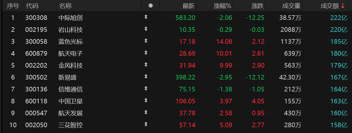 市场震荡拉升,沪指高开高走突破4100点,深成指涨超1%。盘面上,市场热点快速轮动,全市场超3900只个股上涨,连续2日超百股涨停。截至收盘,沪指 涨0.92%,深成指涨1.15%,创业板指涨0.77%。 从板块来看,AI应用概念集体爆发,二十余只成分股涨停,引力传媒5天4板,省广集团、会畅科技、粤传媒、易点天下涨停。 下跌方面,脑机接口概念下挫,美好医疗、倍益康跌超10%。 沪深两市成交额3.12万亿元,较上一个交易日放量3224亿,时隔73个交易日后再度站上3万亿大关,历史第五次突破3万亿。 个股方面,中际旭创、岩山科技成交额破200亿元,分别达222亿元和220亿元,蓝色光标、航天电子、金风科技、新易盛成交额靠前。 | 序号 代码 | | 名称 | ● | 最新 | 涨幅% | 涨跌 | 成交量 | 成交容 | | --- | --- | --- | --- | --- | --- | --- | --- | --- | | 1 | 300308 | 中际旭创 | 1 | 583.20 | -2.06 | -12.25 | 38.57万 | 22 | | 2 | 002195 | 岩山科技 | 4 | ...