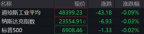 耐克涨近3%,苹果CEO库克斥资近300万美元买入5万股耐克股票。 12月24日,美股三大指数小幅低开,道指跌0.09%,纳指跌0.03%,标普500指数跌0.02%。 英特尔跌超3%,报道称英伟达已暂停对英特尔18A制程工艺的测试。 中概股涨跌不一,纳斯达克中国金龙指数跌0.3%。 编辑丨瑜见 德纳维制药涨38%,赛诺菲以每股15.5美元的现金价格收购该公司的所有流通股。 12月25日(星期四)为美国圣诞节假期,12月24日(星期三)美股提前3小时,即于北京时间25日2点收 盘;12月25日全天休市。 ...