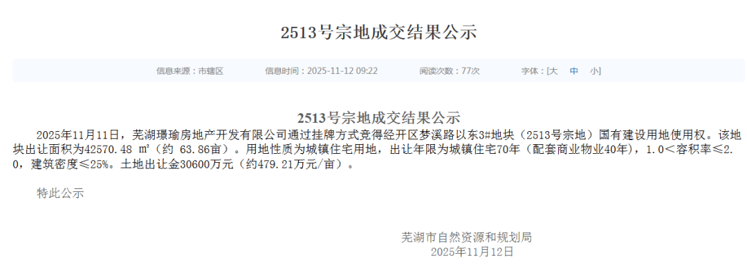 一场紧密衔接的"土地接力"正在上演:11月11日,芜湖璟瑜房地产开发有限公司正式落子经开区,成功竞得梦溪路以东一宗面积约63.86亩的优质住宅用 地,以实实在在的成交为市场注入确定性。而就在此前不久,市场的目光早已被弋江区核心板块牢牢锁定——一宗起始价高达3.85亿元的优质宅地重磅亮 相,其约708万元/亩的起始单价,不仅彰显了核心区位的稀缺价值,更如同一根标尺,重新丈量着城市发展的价值维度。 NO.1|壹 土地市场稳中求进,精准对接城市发展节奏 (一)经开区地块落槌:市场信心的直观体现 2025年11月11日,芜湖璟瑜房地产开发有限公司通过挂牌方式,以总价3.06亿元成功竞得经开区梦溪路以东3号地块(2513号宗地)。该地块出让面积约 63.86亩,用地性质为城镇住宅用地,容积率在1.0至2.0之间,建筑密度上限为25%。折算下来,该地块的成交单价约为479.21万元/亩。 这笔交易的顺利完成,是市场主体对芜湖经开区发展潜力的实际认可。合理的容积率和建筑密度指标,为开发企业打造舒适宜居的住宅产品提供了规划条 件,预示着未来该区域将新增一处品质住区。 (二)弋江区核心地块亮相:城市价值的新标杆 相比之下,于1 ...