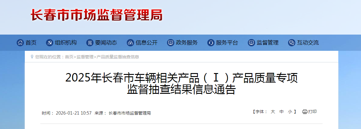 2025年长春市车辆相关产品(Ⅰ)产品质量专项监督抽查结果公布