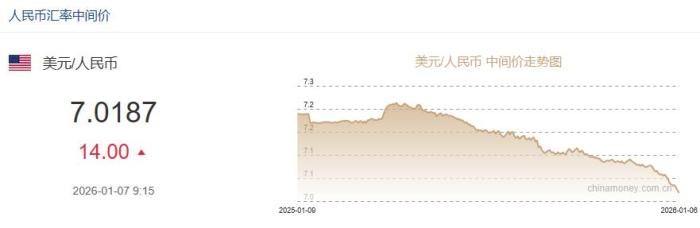 1月7日人民币对美元中间价报7.0187 下调14个基点