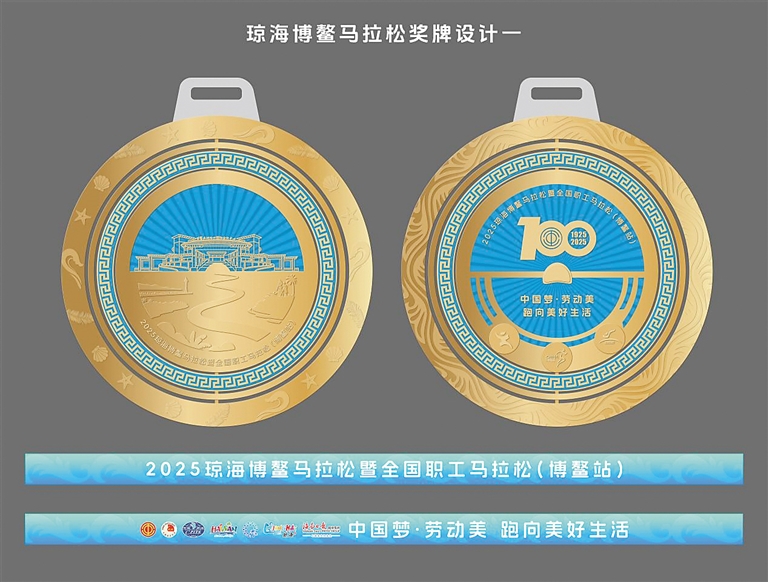 奖牌背面设计庄重而富有新意,与正面协调统一。视觉聚焦工会100周年,醒目的数字"100"与工会Logo 及"1925-2025"字样庄重结合,以此致敬中国工会百年光辉历程与劳动精神。圆形中心镶嵌LED灯,顶部设有 按钮。按下开关,灯光亮起,寓意着点亮赛事、领跑未来。 与奖牌一同亮相的参赛服设计方案同样令人眼前一亮。参赛服主体为蓝、紫、红三种颜色,由浅到深渐 变过渡。服装前胸印有"博鳌"字样和赛事Logo,背面则印有赛事主题;点睛之笔在于下摆,配以黄绿二色的渐 变线条装点,为整件赛服增添了灵动与清爽的气息,助力跑者轻盈开跑。 半程马拉松参赛服。 全国职工马拉松参赛服。 奖牌核心为创新的五层可旋转圆环结构,一环扣一环,象征着同心协力,寓意广大劳动者与跑者同心同 德,共筑中国梦。这一设计巧妙地将个人奋斗、体育精神、地域文化与工会历史环环相扣,紧密相连。每一 环的转动,都寓意着迈向"美好生活"的每一步历程。 马拉松参赛服。 赛事奖牌。 文字整理/海南日报全媒体见习记者 王子豪 本组图片均由主办方提供 ...