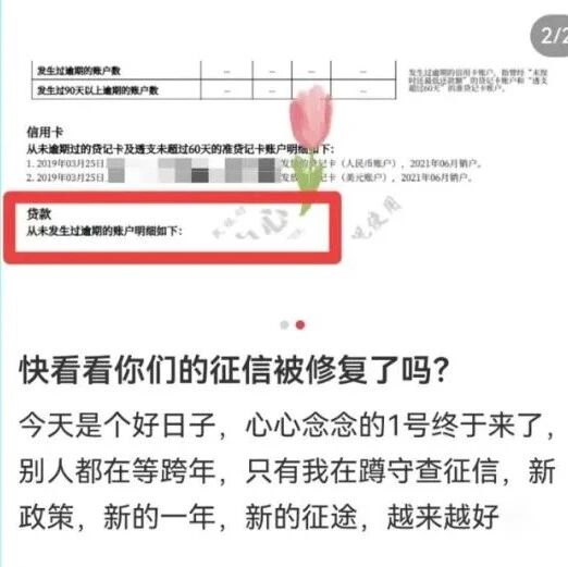 "今天是2026年1月1日,你们查过正(征)信,逾期更新了吗?"在这样一则小红书的帖子下面,网友们 纷纷留言,有的晒出自己的征信报告截图,有的则欣喜地留言" 出来啦,逾期记录全没了""棒棒哒,好 起来啦"。 2026年的第一天,一些网友就迫不及待地查询了自己的征信,不少人惊喜发现,个人征信报告里的贷款 逾期记录减少或清零。 而这,得益于中国人民银行出台的一次性信用修复政策。2025年12月22日,围绕个人征信,央行发布 《中国人民银行关于实施一次性信用修复政策有关安排的通知》(以下简称《通知》),明确对于2020 年1月1日至2025年12月31日期间,单笔金额不超过10000元人民币的个人逾期信息,个人于2026年3月31 日(含)前足额偿还逾期债务的,金融信用信息基础数据库将不予展示。 "我们赶上好政策了" 在2026年的第一天,一次性信用修复政策正式落地。《金融时报》记者关注到,小红书、微博、抖音等 社交媒体上有很多信息主体晒出自己的逾期消除记录。从数据看,绝大部分网友都是通过商业银行手机 银行APP、网上银行、银联云闪付APP第一时间查询了自己的报告。 1月1日,海南的一位网友晒出了自己的征信报告," ...