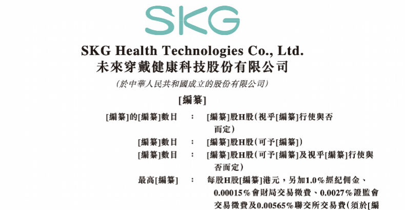 "叒"走在上市的路上。 近日,深圳智能穿戴大卖SKG母公司未来穿戴健康科技股份有限公司(简称"未来穿戴")再次向资本市场发起冲击,这已是其近年来的第3次IPO尝试。 从深交所创业板到北交所,再到如今转向港股,这家手握知名健康品牌的企业,正执着地寻求资本入场券。 据招股书,未来健康2024年实现年收入10.45亿元,股本回报率达18.4%; 若此次成功,它有望成为港股规模最大的按摩设备企业。 | 编纂]的[编纂]數目 | .. | [編纂]股H股(視乎[编纂]行使與否 | | --- | --- | --- | | | | 而定) | | [編纂]數目 | :: | [编纂]股H股(可予[编纂]) | | [编纂]數目 | : | 「編纂]股H股(可予[编纂]及視乎[编纂]行使與 | | | | 否而定) | | 最高[编纂] | .. | 每股H股[编纂]港元,另加1.0%經紀佣金、 | | | | 0.00015%會財局交易徵費、0.0027%證監會 | | | | 交易徵費及0.00565%聯交所交易費(須於[繳 | 【解锁跨境出海增长密码,看看跨境大卖如何在关税壁垒下逆势增长!1月15日,2026跨境电 ...
