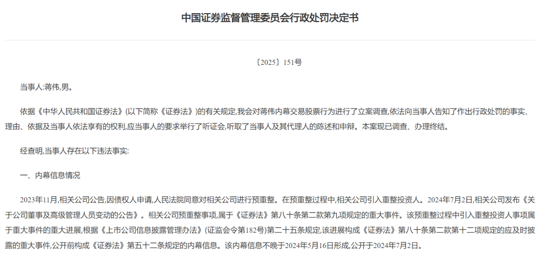 【导读】蒋伟因内幕交易和建议他人买卖证券被没收违法所得 470.97 万元并罚款 1462.92 万元 中国基金报记者 江右 近日,中国证监会发布行政处罚决定书,对蒋伟内幕交易行为和建议他人买卖证券行为,没 收违法所得 4,709,741.41 元,并处以 14,629,224.23 元罚款。 相关公司预重整事项,属于《证券法》第八十条第二款第九项规定的重大事件。该预重整过 程中引入重整投资人事项属于重大事件的重大进展,根据《上市公司信息披露管理办法》第 二十五条规定,该进展构成《证券法》第八十条第二款第十二项规定的应及时披露的重大事 件,公开前构成《证券法》第五十二条规定的内幕信息。该内幕信息不晚于 2024 年 5 月 16 日形成,公开于 2024 年 7 月 2 日。 经查明, 2024 年 6 月 26 日,蒋伟与相关内幕信息知情人存在联络接触。 2024 年 6 月 27 日至 7 月 1 日,蒋伟控制使用其本人及多个他人证券账户买入相关公司股票,内幕信息 公开后全部卖出,共计获利 4,709,741.41 元。蒋伟交易行为明显异常,且无正当理由或正 当信息来源,一是交易买入时点与其和内幕信息知情 ...